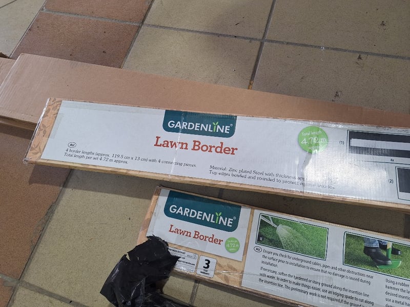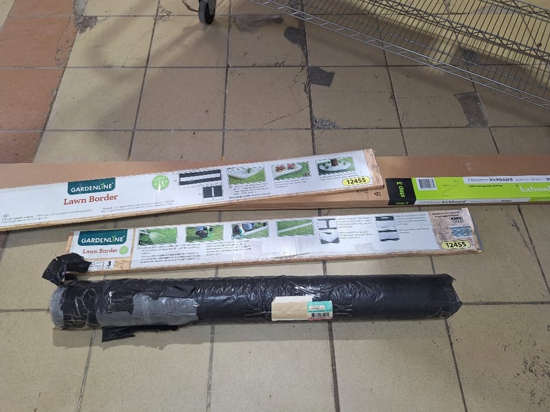 Bundle of garden edging and landscaping materials including two Gardenline Lawn Border sets, 2 Kaboodle 2400mm aluminium kickboard & Fly Screen