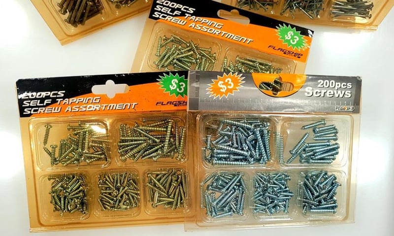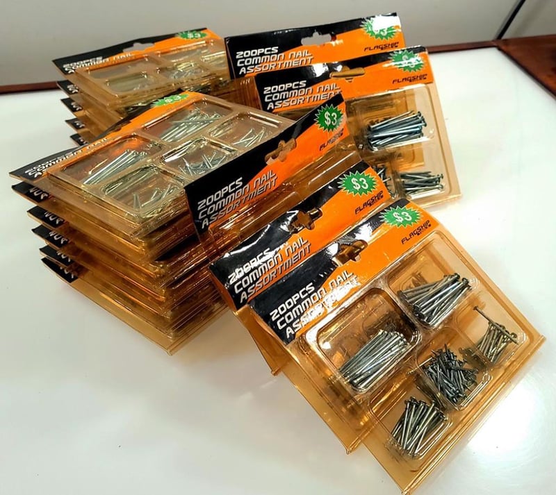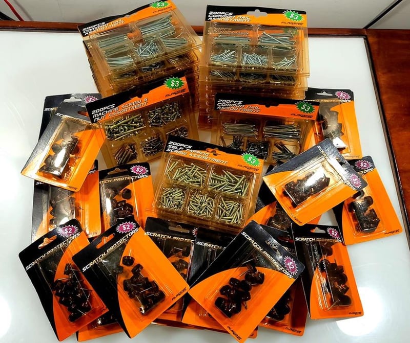 Bulk Box of Hardware - Nails, Screws + Scratch Protectors.Bulk box full of new/old stock:18 x packs of 200 common nails in 5 sizes;3 x packs of 200 self tapper screws in 5 sizes;1 pack of 200 machine thread screws and nuts;21 x packs of 12 furniture scratch protectors (protects the floor).All new (old stock) in original packs. Some of the clear packaging has yellowed, but the items inside are all good. Please see pics. RRP for all 43x packs = $108!
