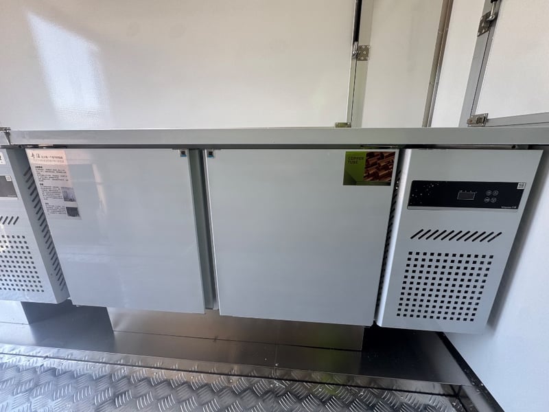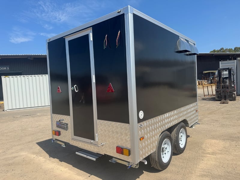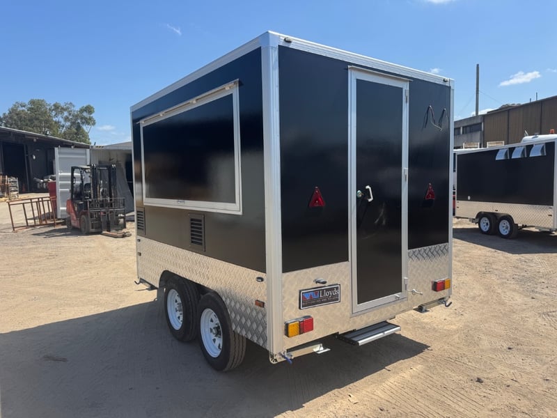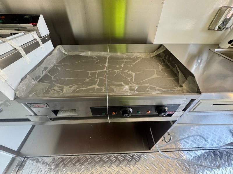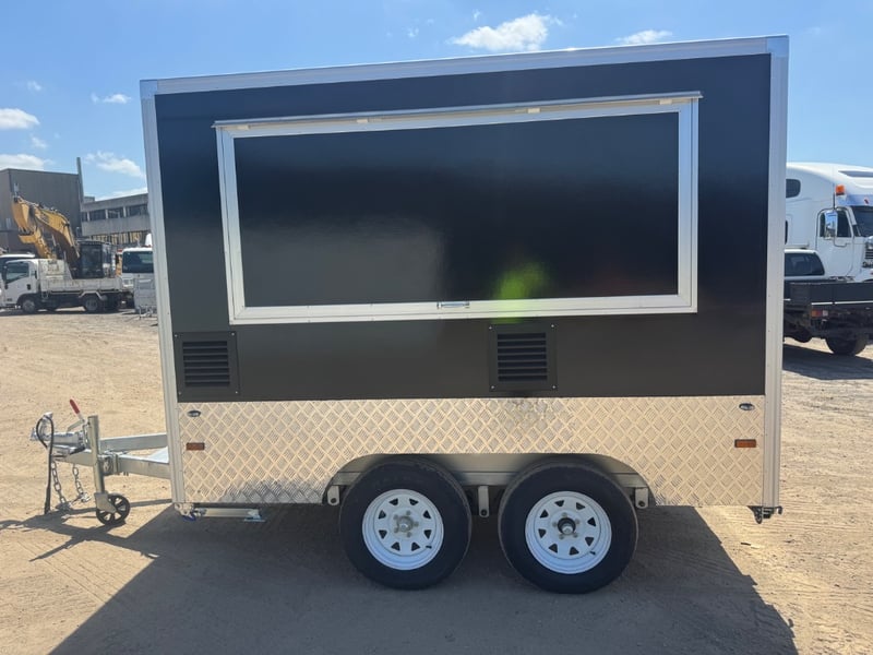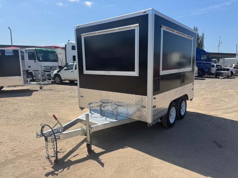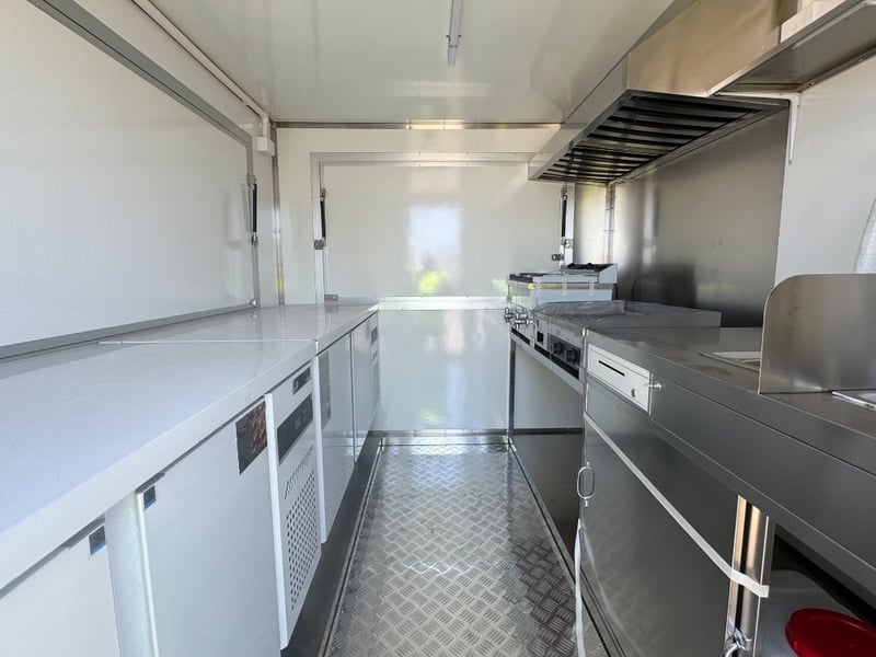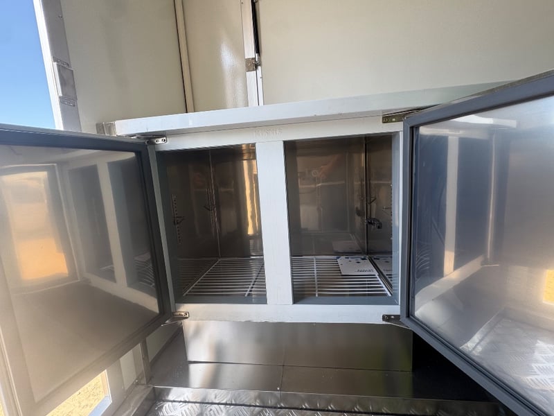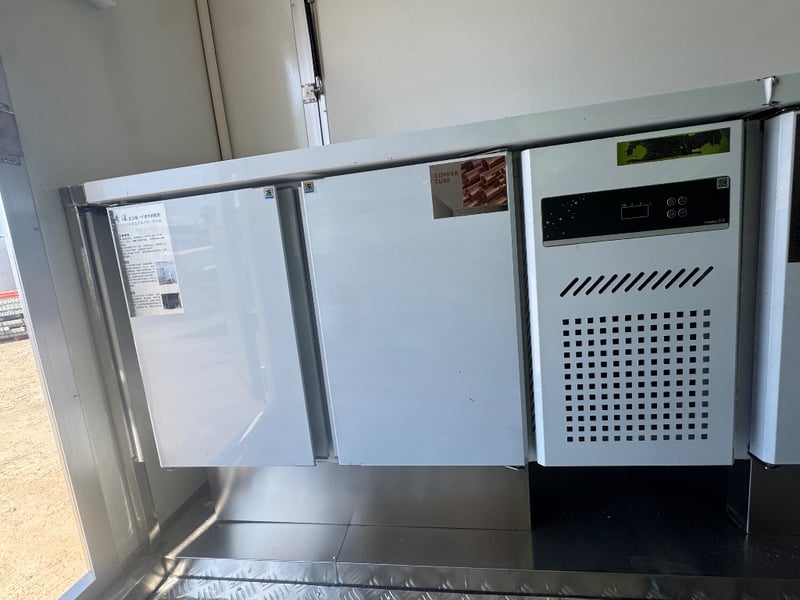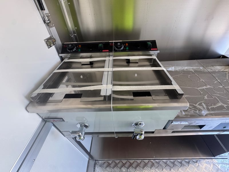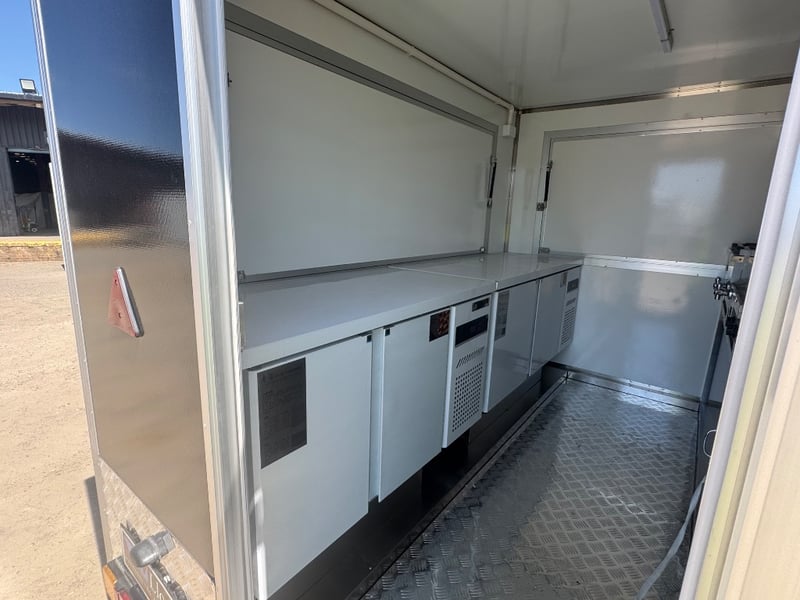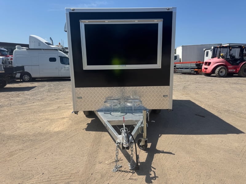 Description: Equipment and Internal Fit Out: Aluminium Checker Plate Non-Slip Flooring with Drain for Easy Cleaning, 2 x 30 Litre Water Tanks and 20 Litre Waste Tank, Double Bowl Sink with Hot and Cold Water and Additional Sink, suitable for Hand Washing or Rinsing with Hot and Cold Water, Stainless Steel Bench Tops, Under Bench Type 2 Door Freezer with Stainless Steel Top, Under Bench Type 2 Door Refrigerator with Stainless Steel Top, Electric 12 Litre Double Fryer, 730mm Hot plate, Stainless Steel Rangehood/Exhaust 1350mm, Cash Draw, Window Openings: 1 x 940mm (H) x 1600mm (W), 1 x 940mm (H) x 2090mm (W) Lift Up Service Windows, Fibreglass Body Panels with Thermal Insulation, Rear Door with Lock, Porch 2100mm x 2050mm with Stainless Steel Rails Enclosure and 2 x Entry Gates Each Side and Checker Plate Finish, Checker Plate Protection on the Front and Sides, chassis and Frame Constructed with Galvanised Steel, Electrical Brakes Fitted (not connected), Brakes Override Mechanical Braking System, Electrical: LED Tail Lights, 1 x LED Internal Lights, Fully Wired with Circuit Board (to be tested by qualified electrician), Heavy Duty Jockey wheel.
