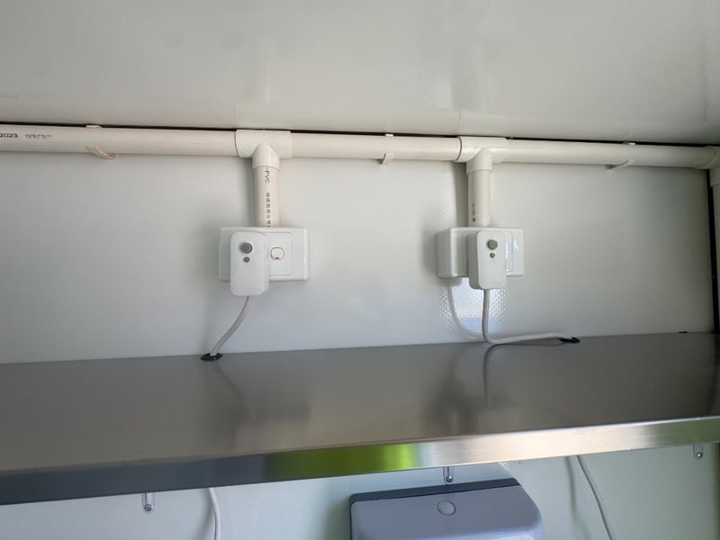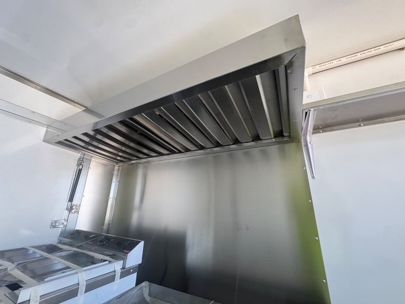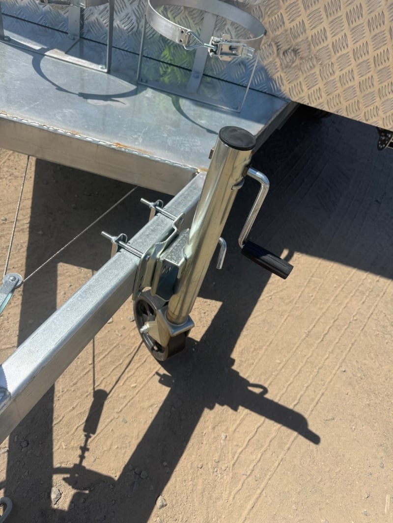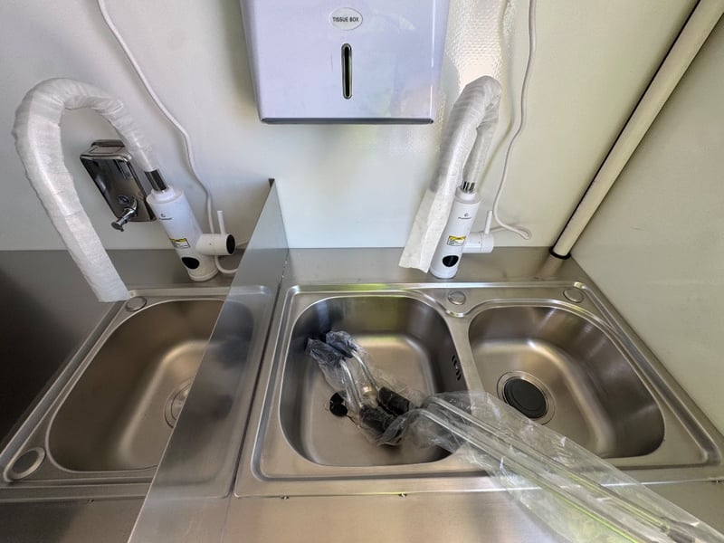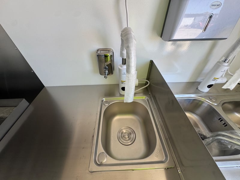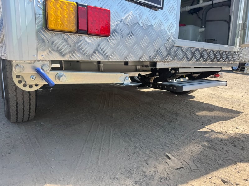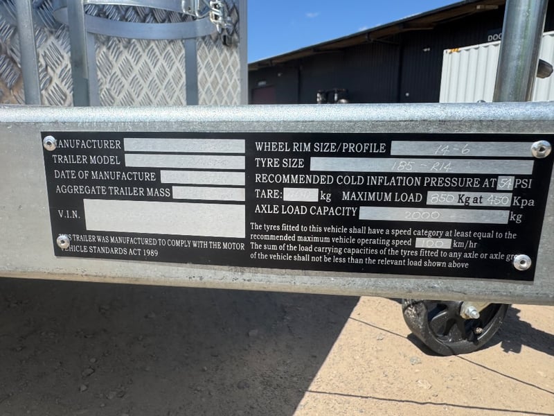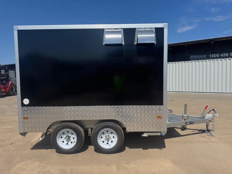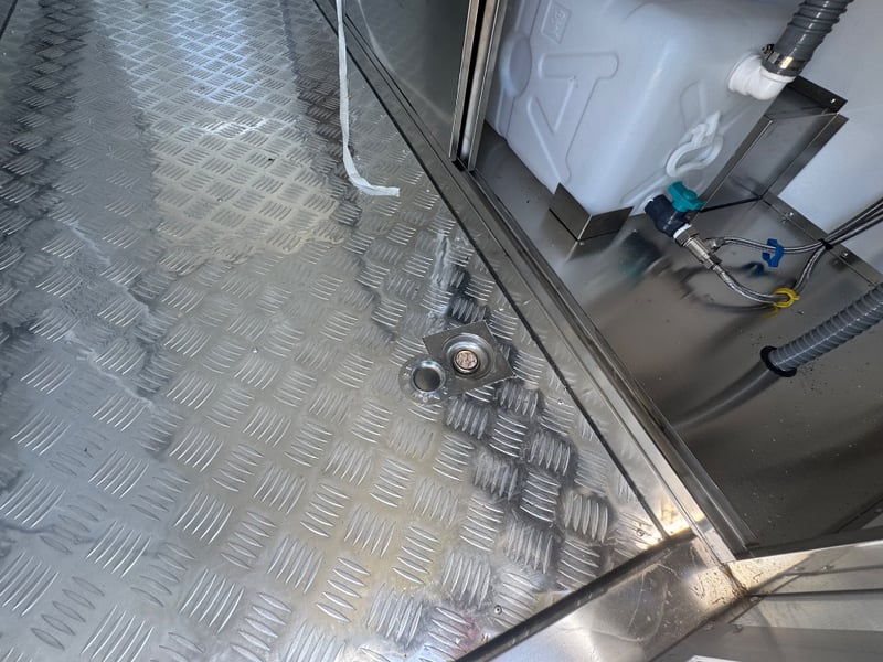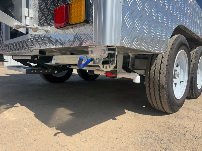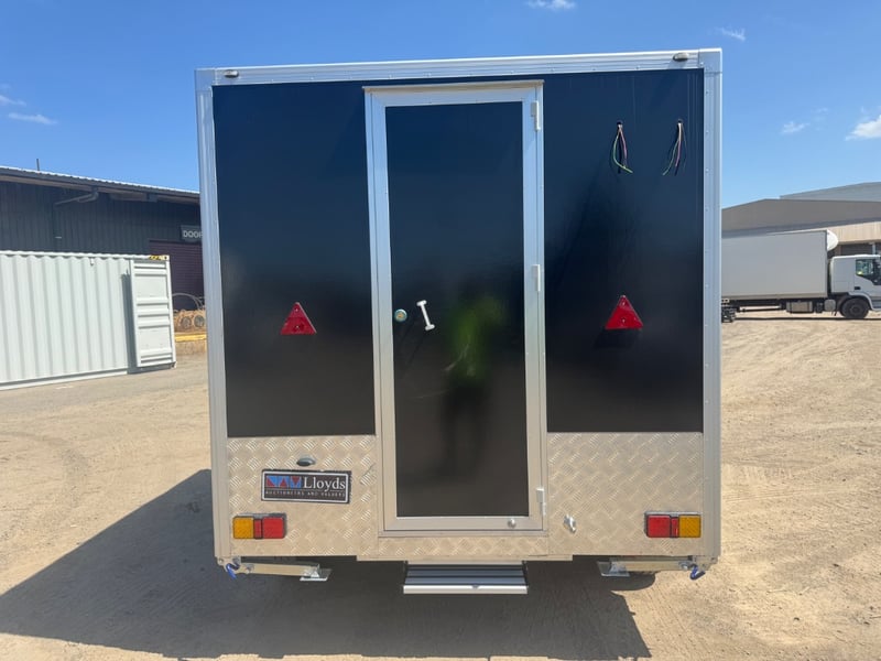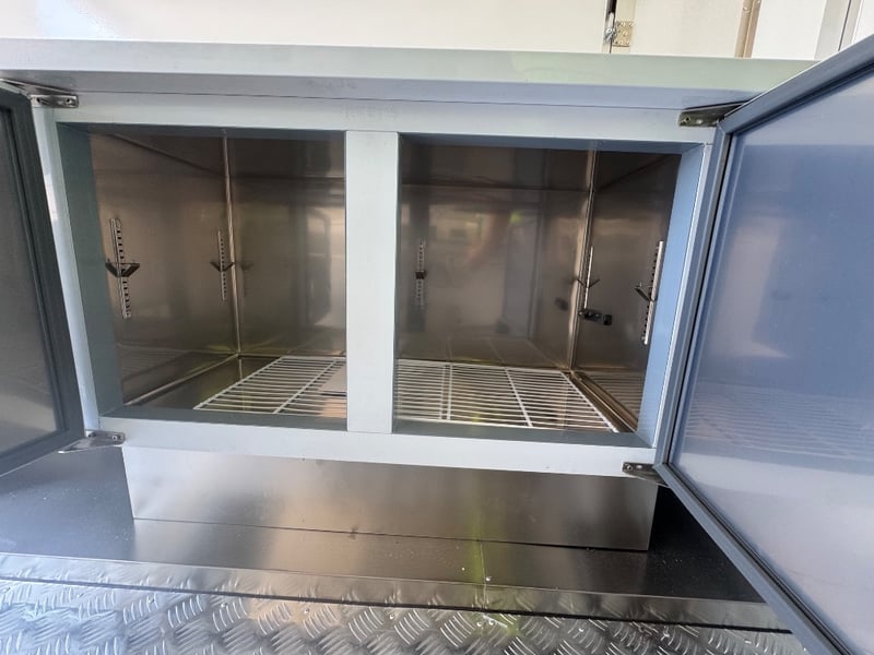 Description: Equipment and Internal Fit Out: Aluminium Checker Plate Non-Slip Flooring with Drain for Easy Cleaning, 2 x 30 Litre Water Tanks and 20 Litre Waste Tank, Double Bowl Sink with Hot and Cold Water and Additional Sink, suitable for Hand Washing or Rinsing with Hot and Cold Water, Stainless Steel Bench Tops, Under Bench Type 2 Door Freezer with Stainless Steel Top, Under Bench Type 2 Door Refrigerator with Stainless Steel Top, Electric 12 Litre Double Fryer, 730mm Hot plate, Stainless Steel Rangehood/Exhaust 1350mm, Cash Draw, Window Openings: 1 x 940mm (H) x 1600mm (W), 1 x 940mm (H) x 2090mm (W) Lift Up Service Windows, Fibreglass Body Panels with Thermal Insulation, Rear Door with Lock, Porch 2100mm x 2050mm with Stainless Steel Rails Enclosure and 2 x Entry Gates Each Side and Checker Plate Finish, Checker Plate Protection on the Front and Sides, chassis and Frame Constructed with Galvanised Steel, Electrical Brakes Fitted (not connected), Brakes Override Mechanical Braking System, Electrical: LED Tail Lights, 1 x LED Internal Lights, Fully Wired with Circuit Board (to be tested by qualified electrician), Heavy Duty Jockey wheel.