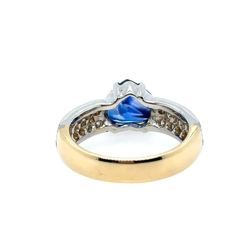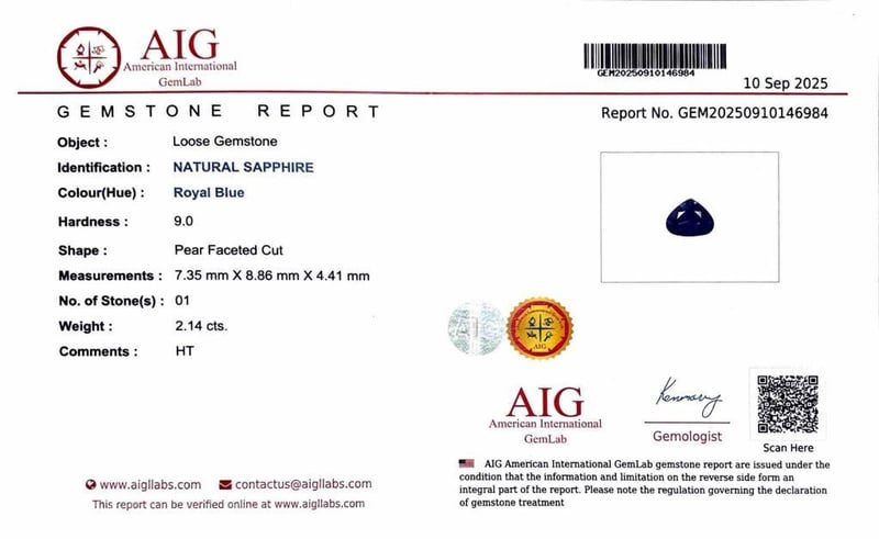 Featuring A Pear Cut Sapphire, Claw Set, 2.14Ct In Weight (7.35 X 8.86 X 4.41 Mm), And Royal Blue In Colour As Per Aig Report Number Gem20250910146984. 36 Round Brilliant Cut Diamonds, Set In Shoulders Of Ring, 1.05Ct In Total Combined Weight, Vs In Clarity And G In Colour.