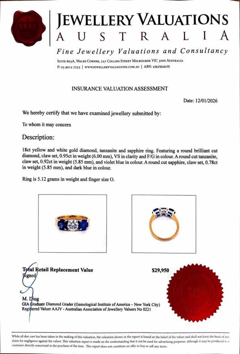 18CT YELLOW AND WHITE GOLD DIAMOND, TANZANITE AND SAPPHIRE RINGFeaturing A Round Brilliant Cut Diamond, Claw Set, 0.95Ct In Weight (6.00 Mm), Vs In Clarity And F/G In Colour. A Round Cut Tanzanite, Claw Set, 0.92Ct In Weight (5.85 Mm), And Violet Blue In Colour. A Round Cut Sapphire, Claw Set, 0.78Ct In Weight (5.85 Mm), And Dark Blue In Colour.Ring Is 5.12 Grams In Weight And Finger Size O.Total Item Weight: 5.12gCondition: Good - Refer To ImagesThis valuation has been conducted by an independent third-party professional. The valuation amount is an assessment by the issuing valuer and does not reflect the auction value of the item.Any inquiries regarding the valuation should be directed to the issuing valuer (refer to contact details on the certificate), as Lloyds Auctions has no affiliation or influence over the valuation, the valuer, or the stated amount.Insurance Replacement Valuation Amount: $29,950.00163039+11