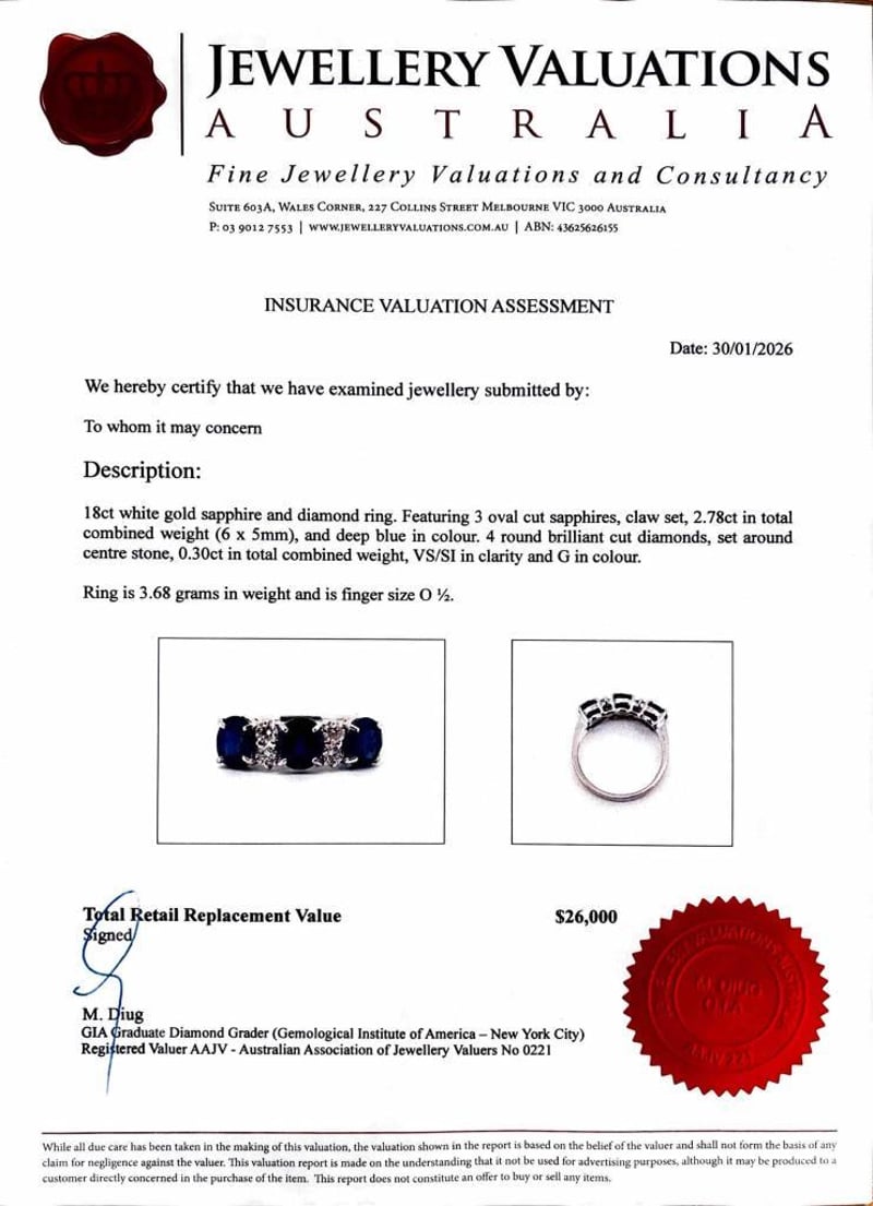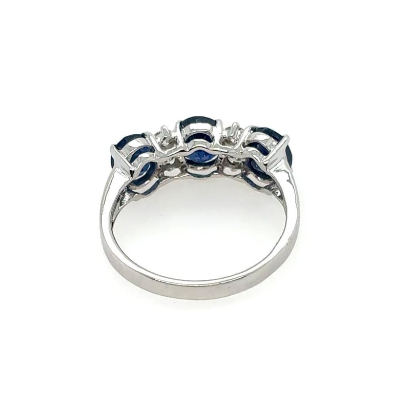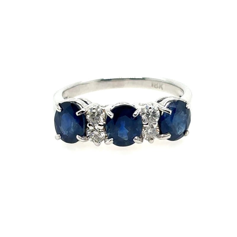 Featuring 3 Oval Cut Sapphires, Claw Set, 2.78Ct In Total Combined Weight (6 X 5Mm), And Deep Blue In Colour. 4 Round Brilliant Cut Diamonds, Set Around Centre Stone, 0.30Ct In Total Combined Weight, Vs/Si In Clarity And G In Colour.