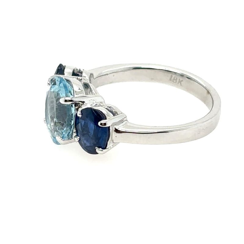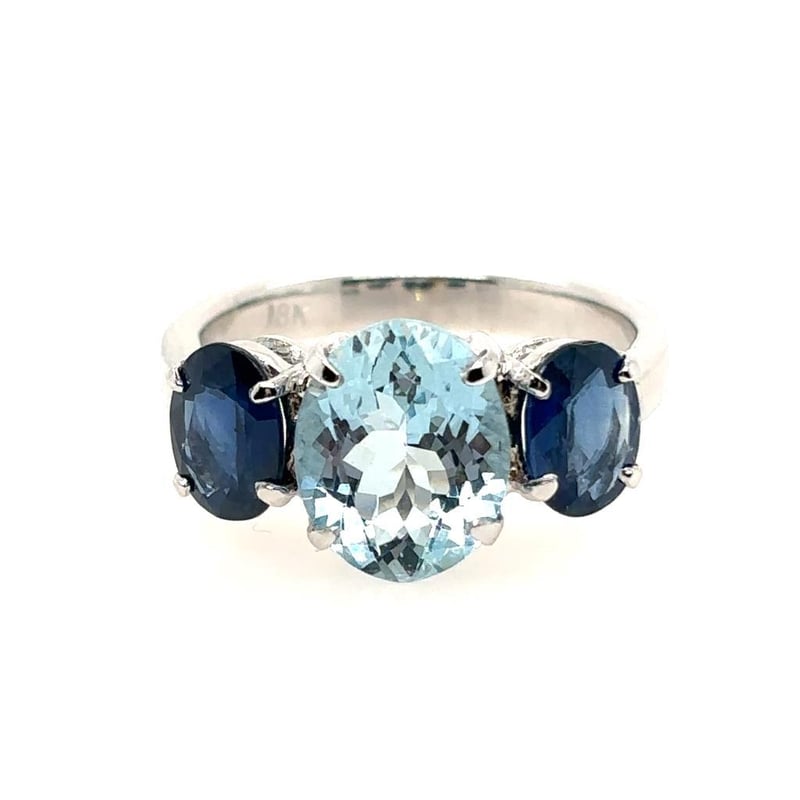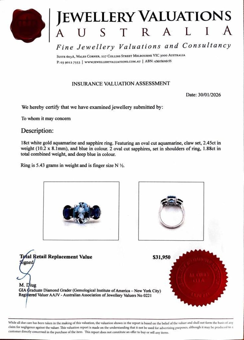 18CT WHITE GOLD AQUAMARINE AND SAPPHIRE RINGFeaturing An Oval Cut Aquamarine, Claw Set, 2.45Ct In Weight (10.2 X 8.1Mm), And Blue In Colour. 2 Oval Cut Sapphires, Set In Shoulders Of Ring, 1.88Ct In Total Combined Weight, And Deep Blue In Colour.Ring Is 5.43 Grams In Weight And Is Finger Size N ½.Total Item Weight: 5.43gCondition: Good - Refer To ImagesThis valuation has been conducted by an independent third-party professional. The valuation amount is an assessment by the issuing valuer and does not reflect the auction value of the item.Any inquiries regarding the valuation should be directed to the issuing valuer (refer to contact details on the certificate), as Lloyds Auctions has no affiliation or influence over the valuation, the valuer, or the stated amount.Insurance Replacement Valuation Amount: $31,950.00163039+18