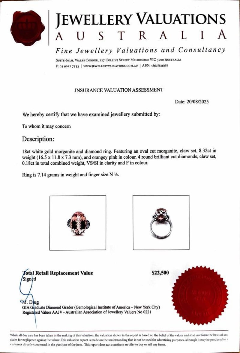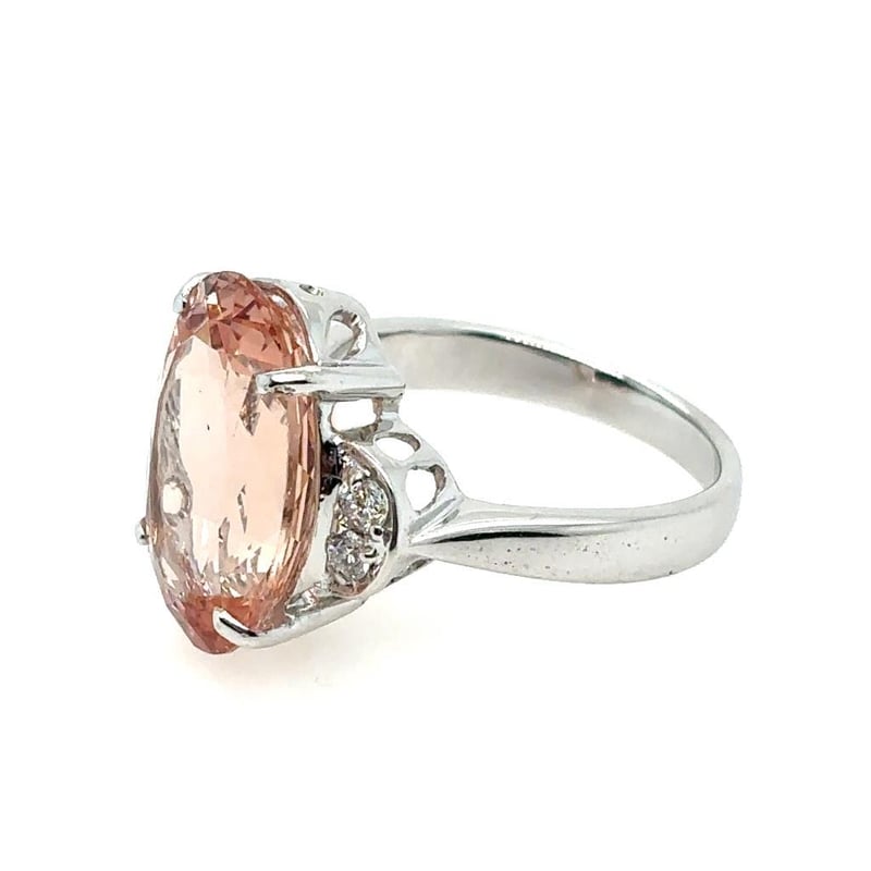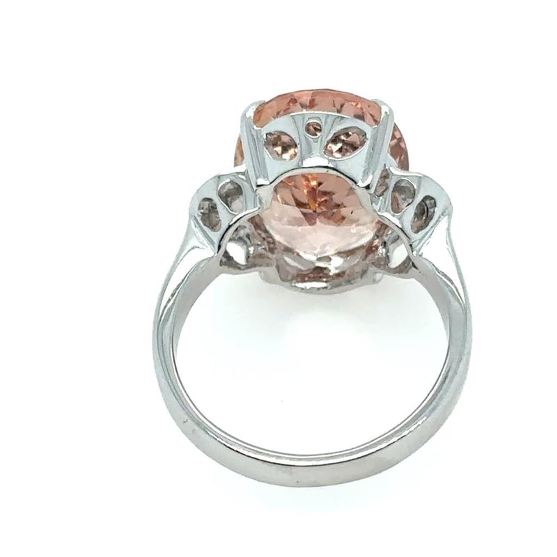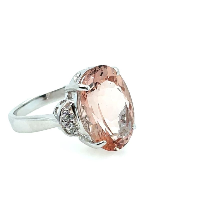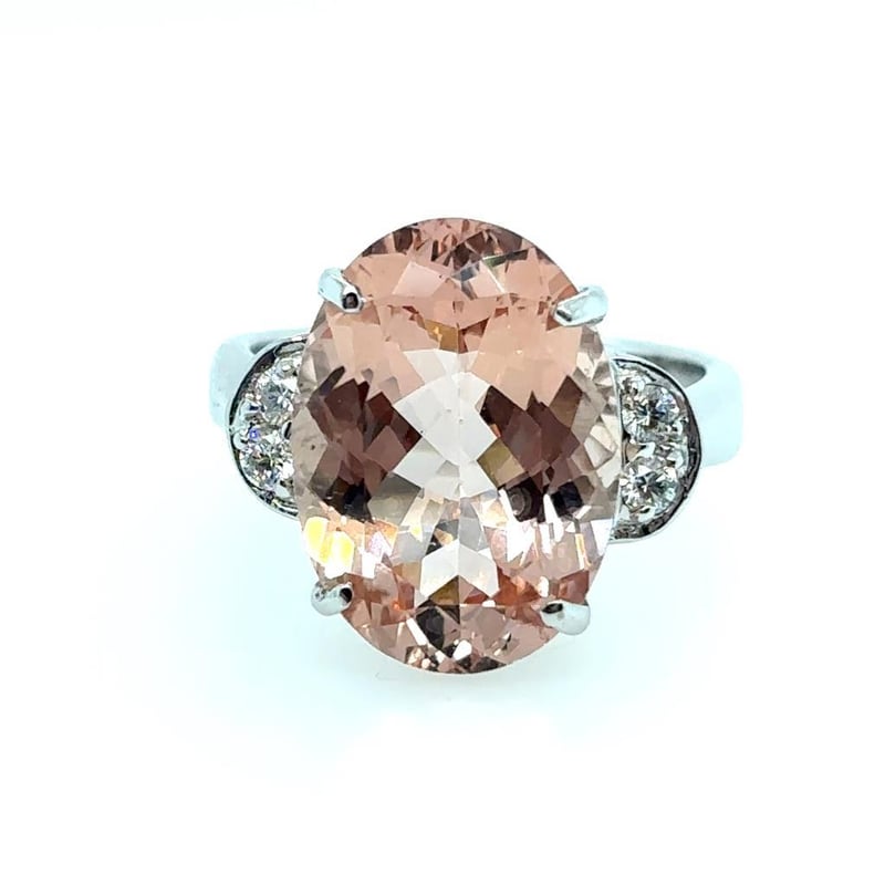 Featuring An Oval Cut Morganite, Claw Set, 8.32Ct In Weight (16.5 X 11.8 X 7.3 Mm), And Orangey Pink In Colour. 4 Round Brilliant Cut Diamonds, Claw Set, 0.18Ct In Total Combined Weight, Vs/Si In Clarity And F In Colour.
