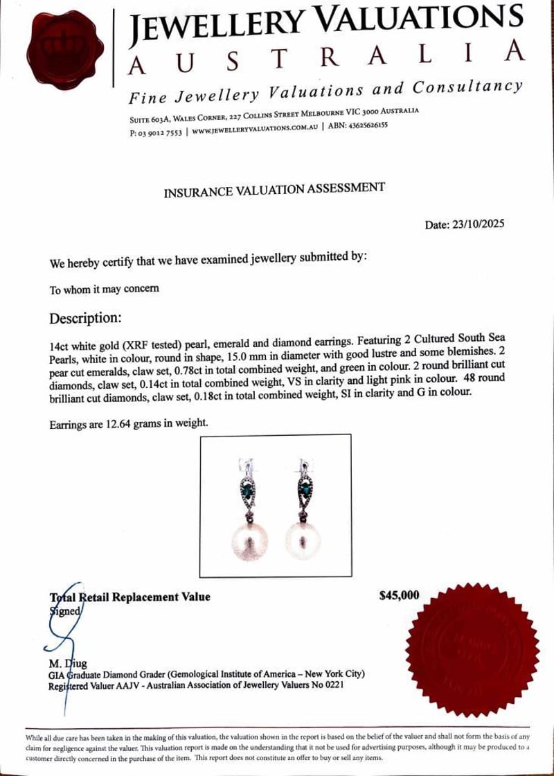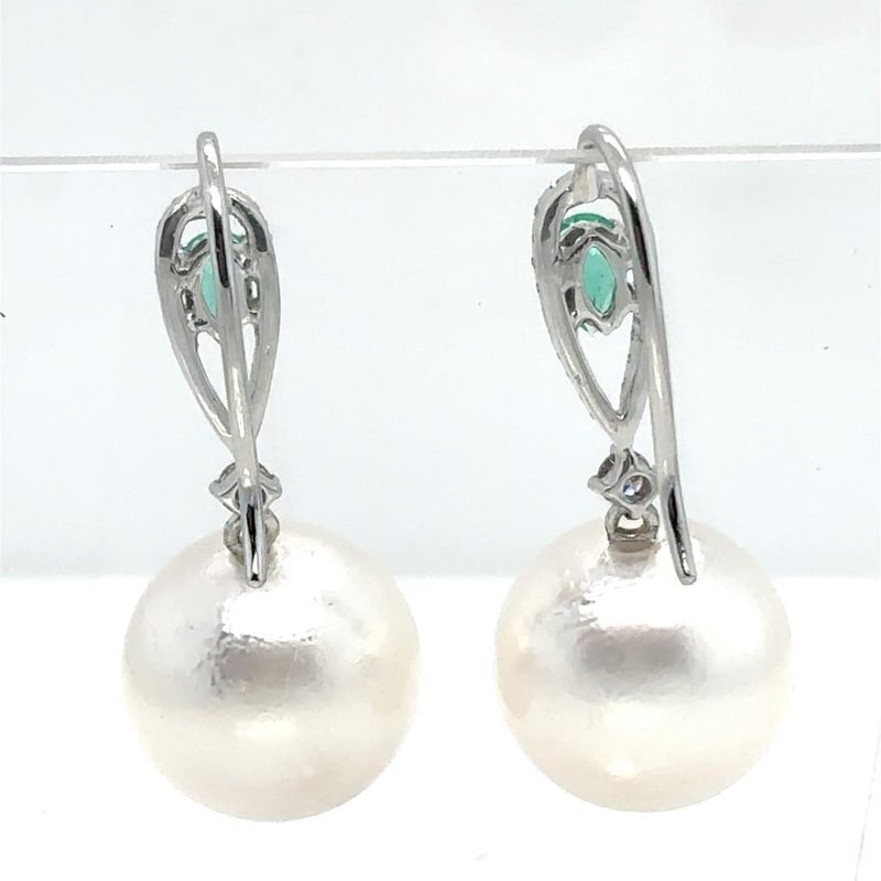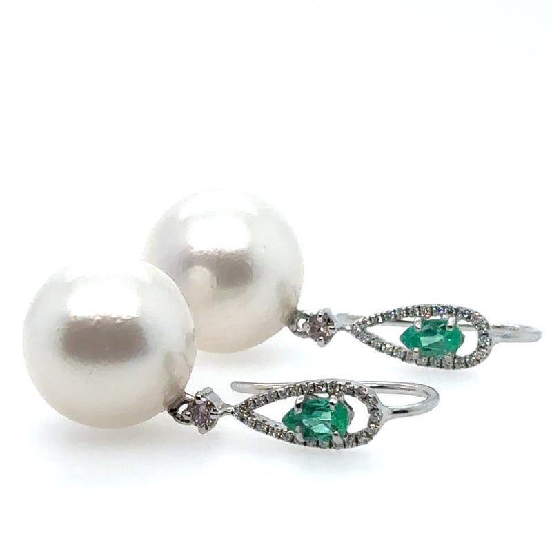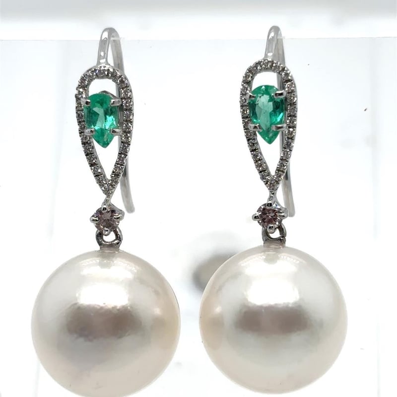 Featuring 2 Cultured South Sea Pearls, White In Colour, Round In Shape, 15.0 Mm In Diameter With Good Lustre And Some Blemishes. 2 Pear Cut Emeralds, Claw Set, 0.78Ct In Total Combined Weight, And Green In Colour. 2 Round Brilliant Cut Diamonds, Claw Set, 0.14Ct In Total Combined Weight, Vs In Clarity And Light Pink In Colour. 48 Round Brilliant Cut Diamonds, Claw Set, 0.18Ct In Total Combined Weight, Si In Clarity And G In Colour.