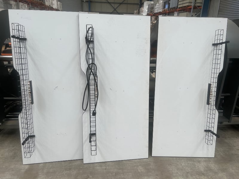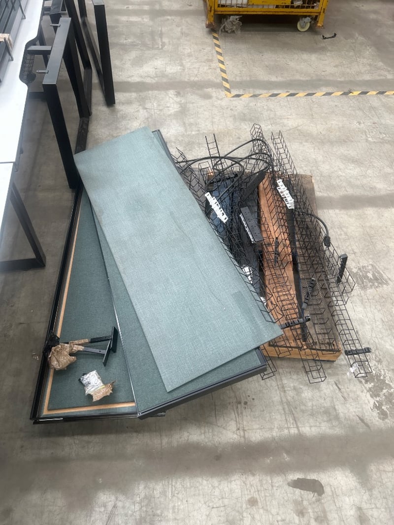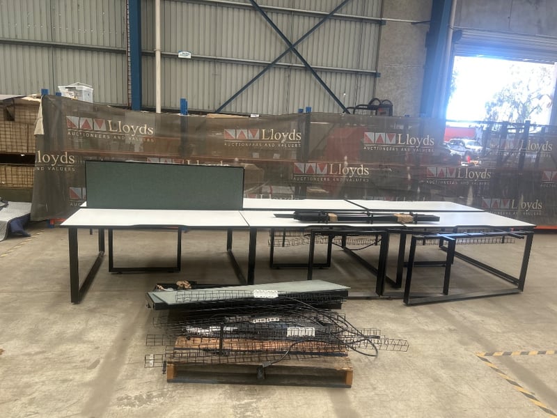 Office workstation/desk, assorted items include worktops, privacy screens, metal frames and cable trays. Neutral colour finishSold as lot