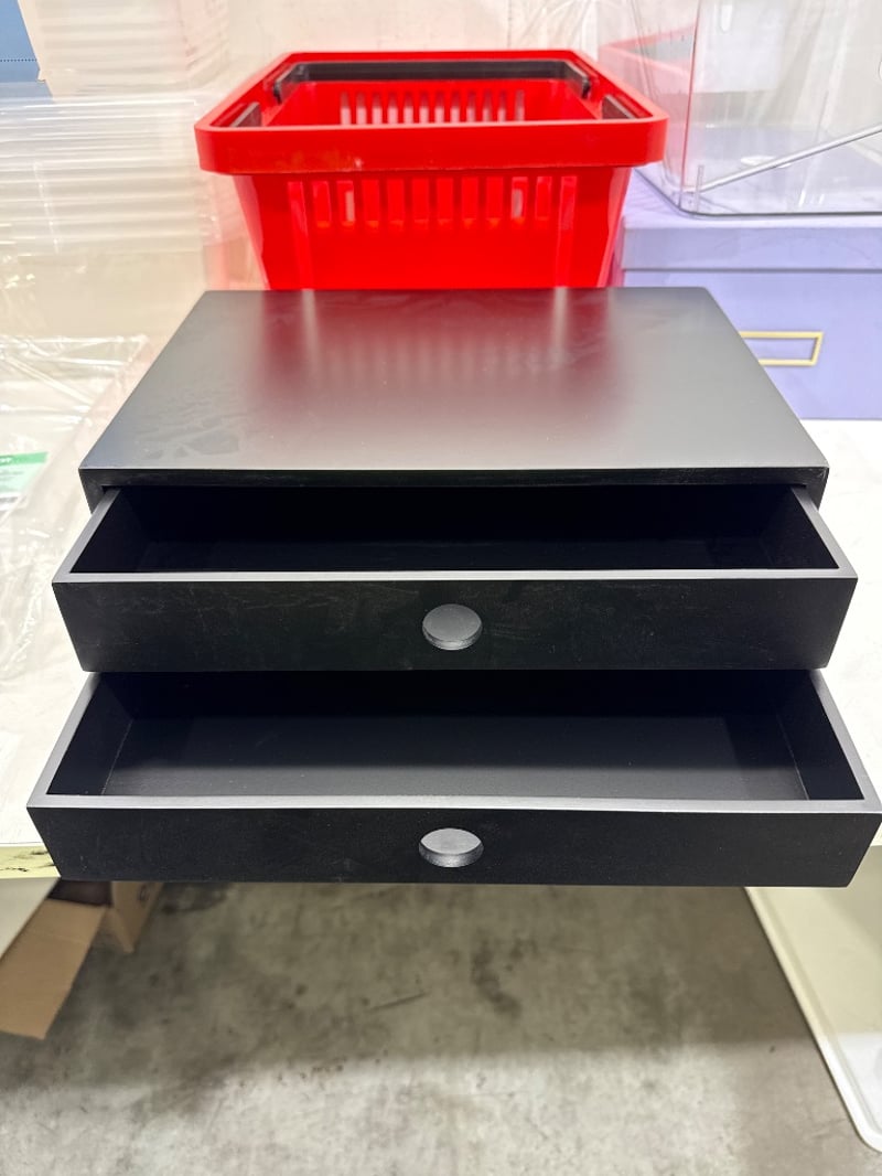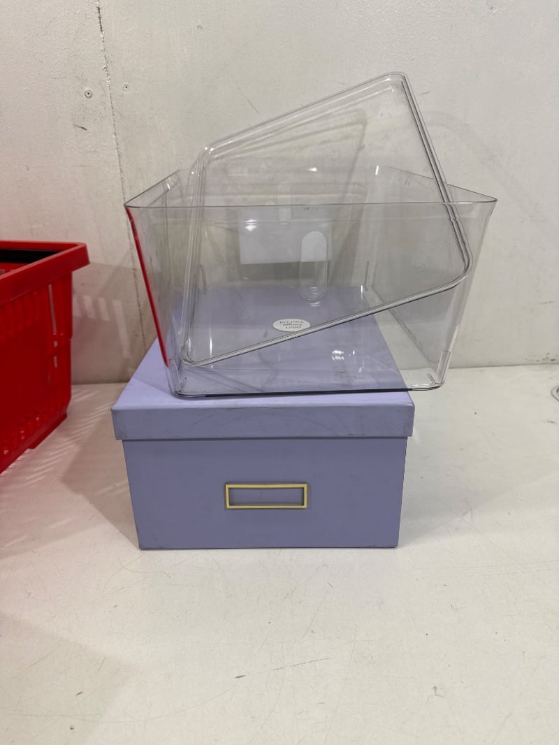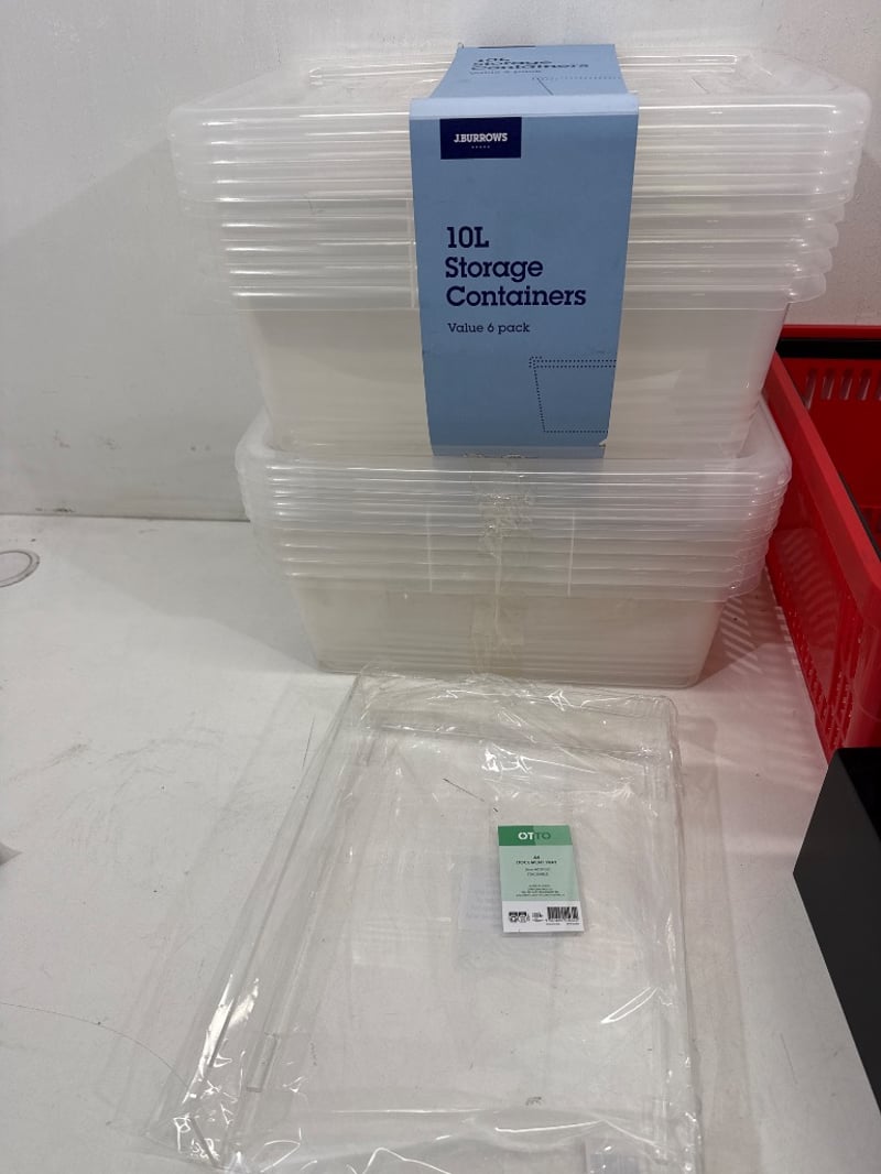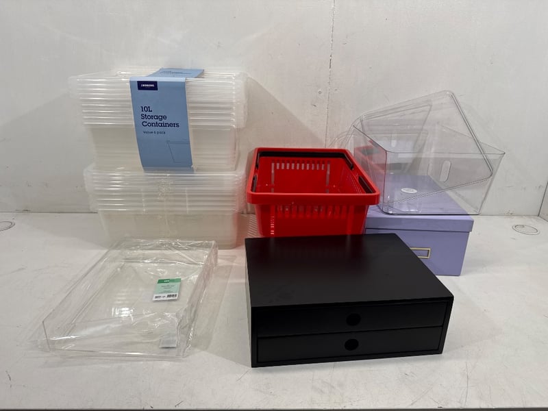 Containers, Brands include J.Burrows, Otto ect. Items include 20L Storage containers, A4 Document Tray, Shopping Basket ect. Quantity- Sold as lot.