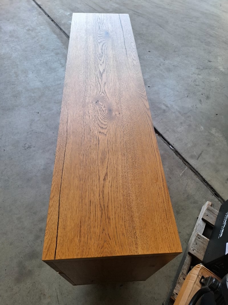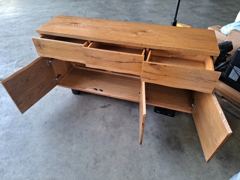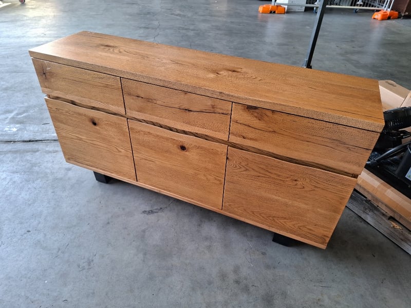 Natural stains timber buffet, 3 drawers, 3 doors Dimensions: 15 cm (W) x 37.5 cm (D) x 81 cm (H)Note: wobbly legs
