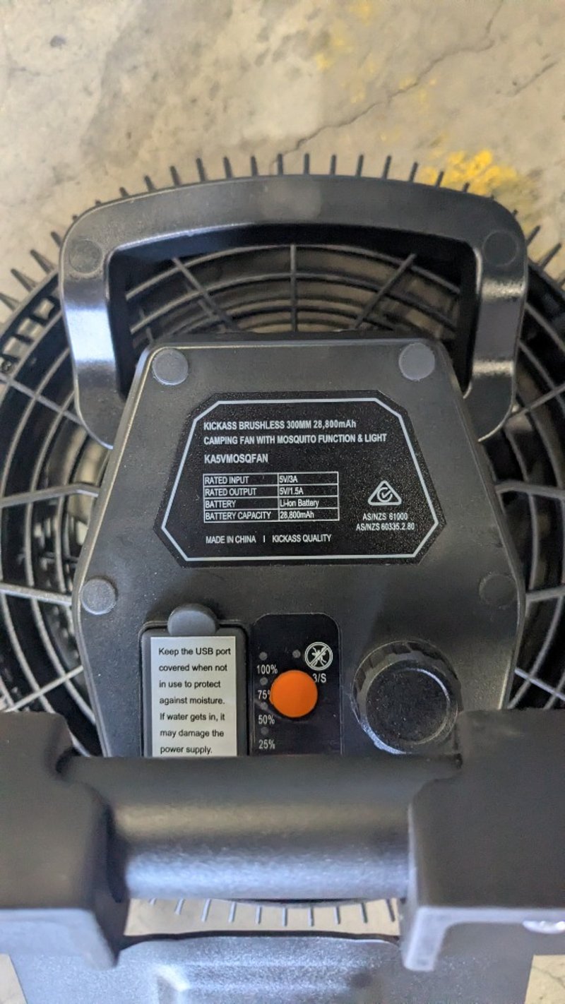 KickAss Brushless 300mm 28800mAh Camping Fan with Mosquito Function & light, RRP: 159.95Description/Extras: Stay cool wherever you camp with the KickAss Brushless 300mm Camping Fan with Mosquito Function & Light. Built tough with a durable design and powerful brushless motor, it delivers strong, reliable airflow via the large 220mm rotating blade, and will last over 9 days on a single charge! With an integrated LED light, it keeps you cool through every adventure.Large 300mm Fan Diameter with Stepless Wind Speed AdjustmentBrushless Motor28,800mAh High Capacity Battery & Power BankRated IPX6 Water resistantMosquito Repellent Technology