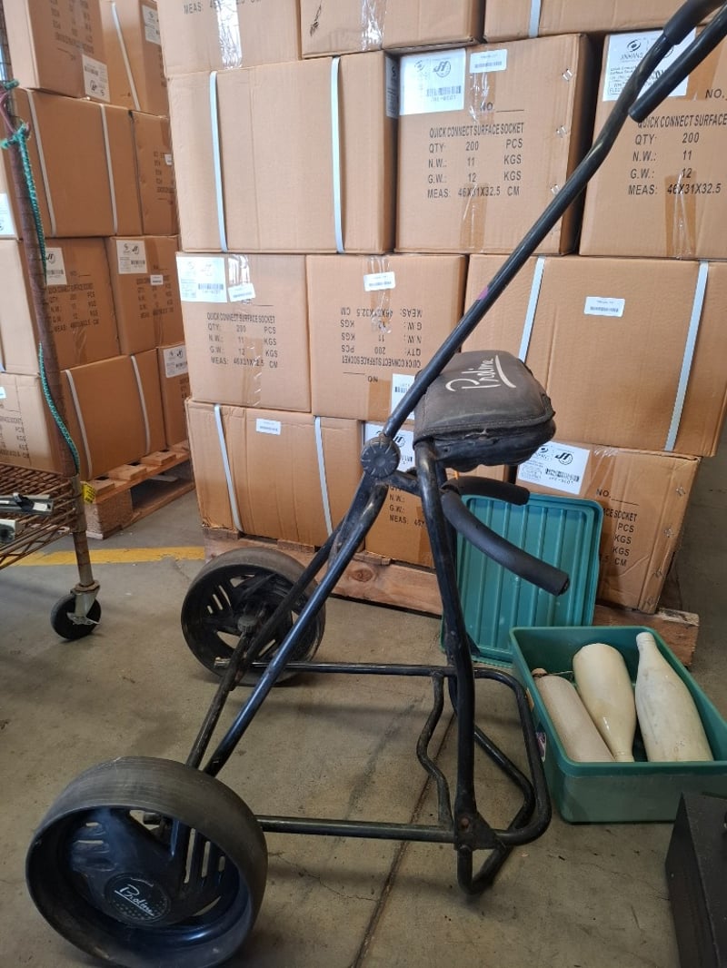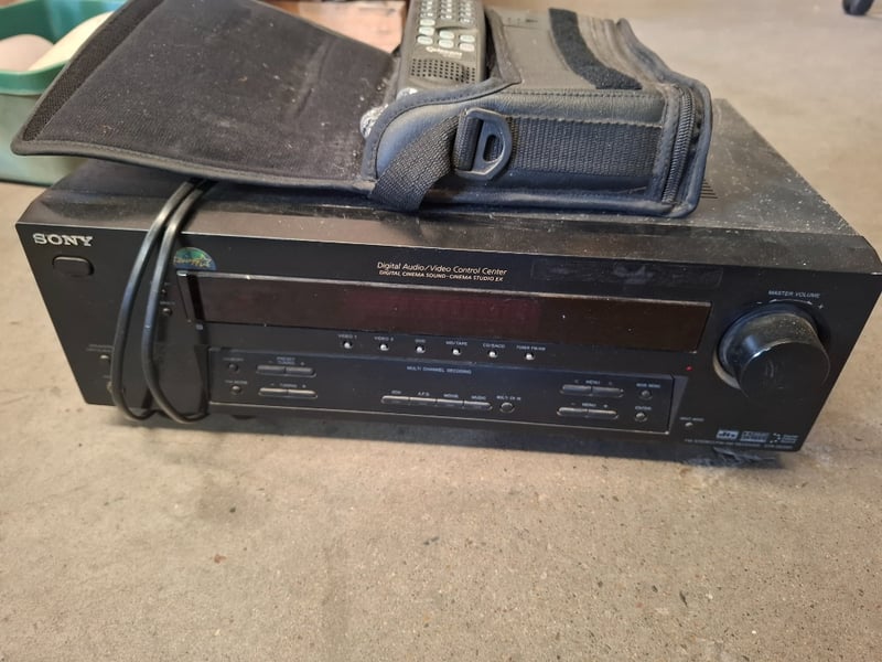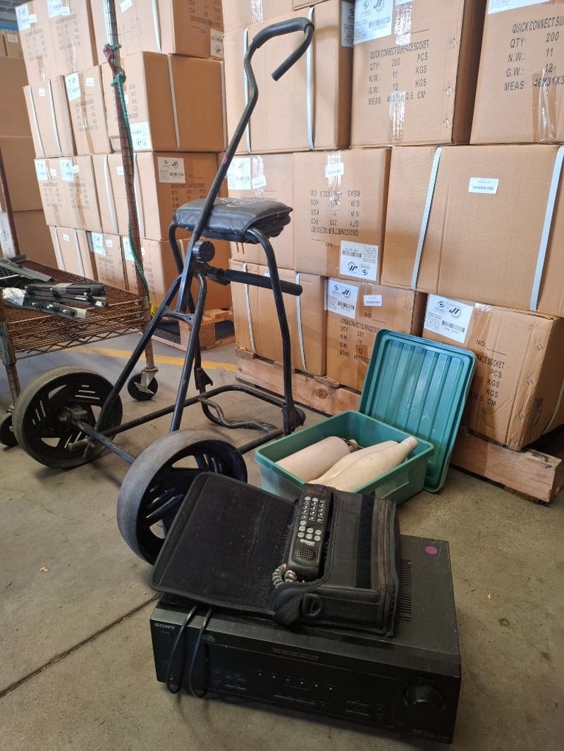 Assortment lot of intems includes a Sony digital audio/video controller centre, old Motorola phone, ceramic Botlles and golf trolley Sold as lot