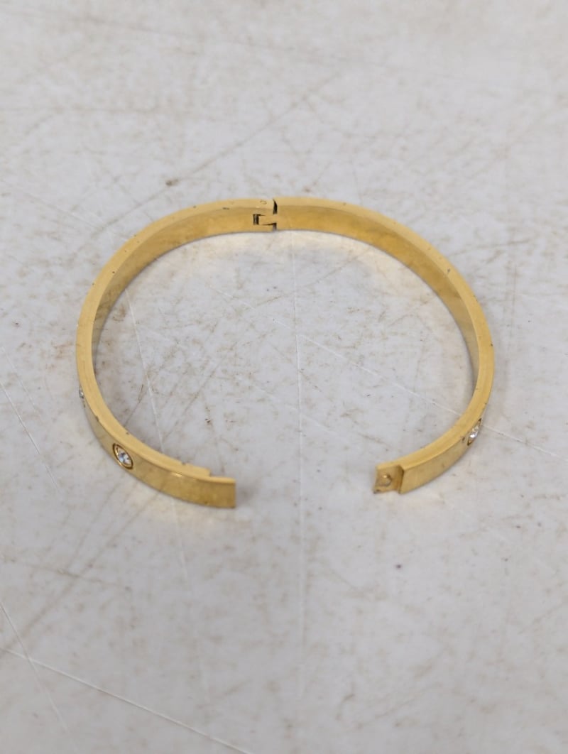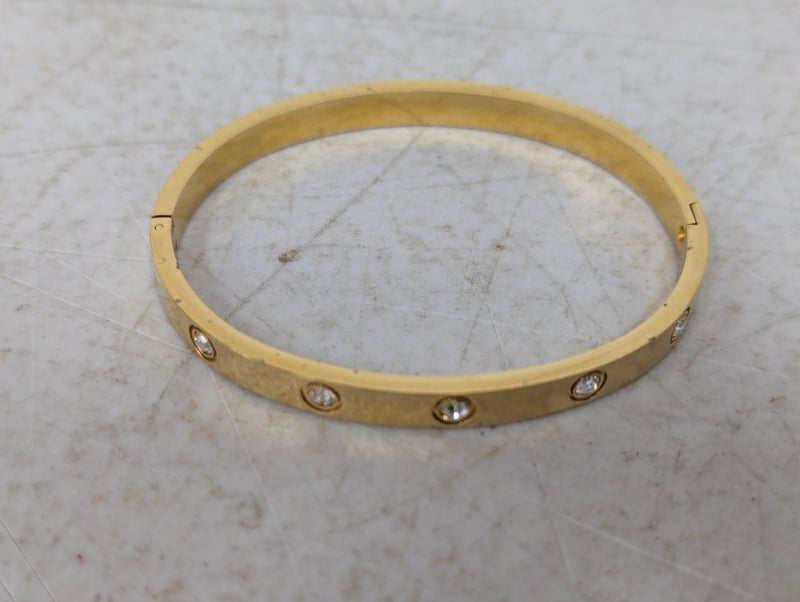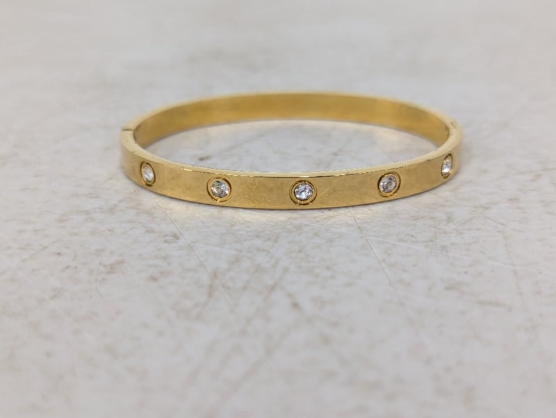 Bangle, gold coloured with white stones, hinged