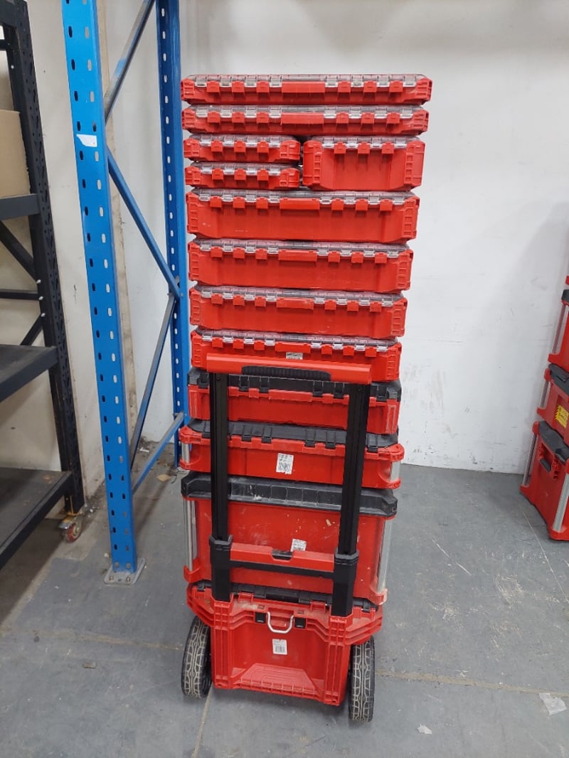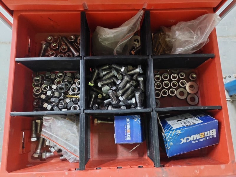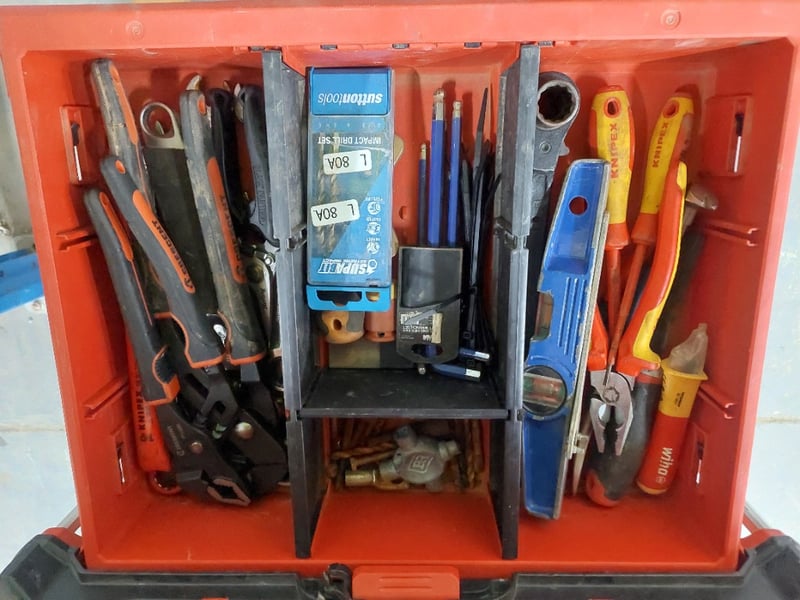 Packout boxes containing nuts and bolts, miscellaneous electrical tools, and miscellaneous tools
