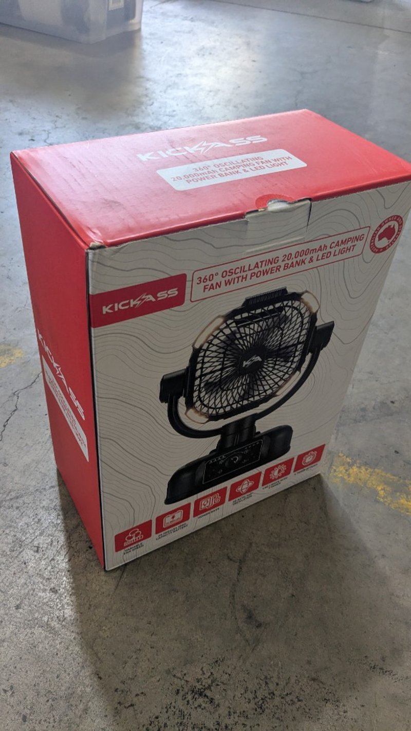 Kickass 360° Oscillating 20,000mAh Camping Fan with Power Bank & Light, RRP: $79.95,