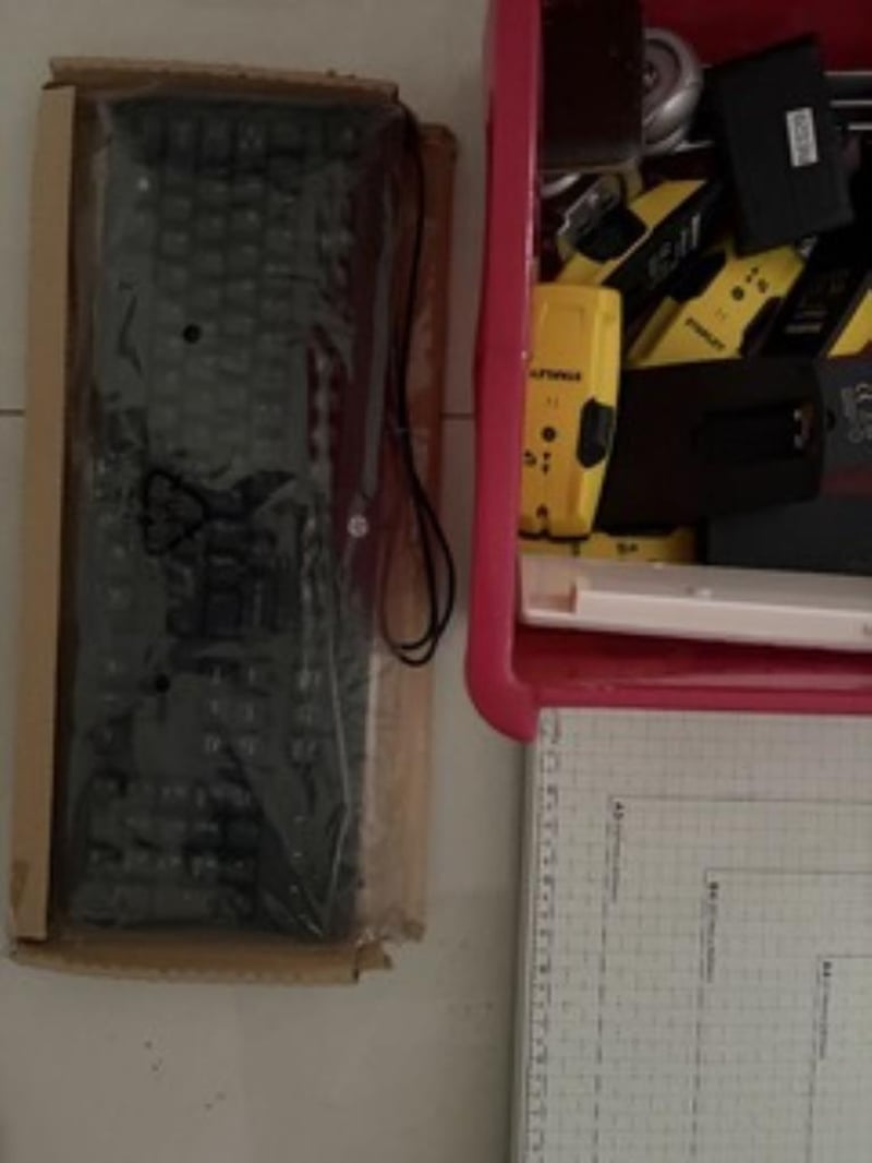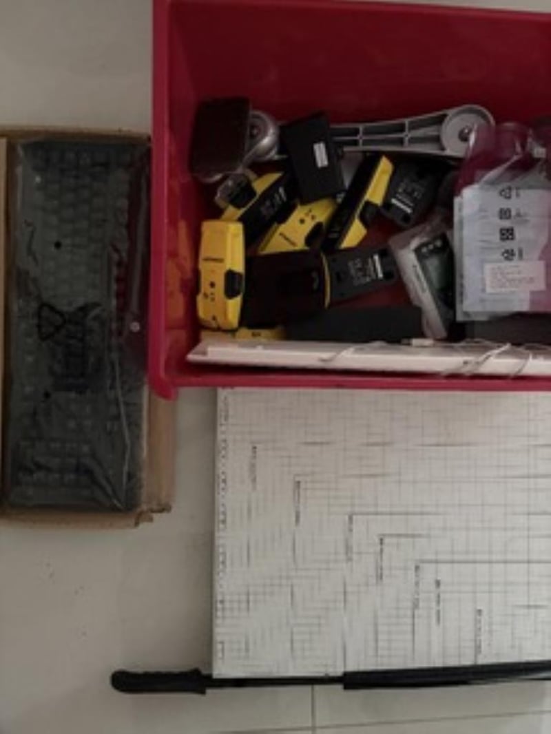 Bulk lot of Stanley stud finders , paper cutter and HP KeyboardSold as used and untested