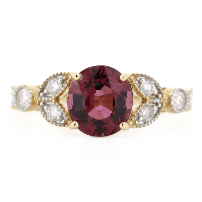 The Centre Features, One Round Brilliant Cut, Burgundy Red, Rhodolite Garnet (1.92Ct, Eye Clean Clarity), 4 Claw Set. Decorating The Band Are, 14 Round Brilliant Cut, Diamonds (0.29Ct Tdw, G-H Colour, Si-I1 Clarity), Bead/Bezel Set. Ring Size M 1/2.