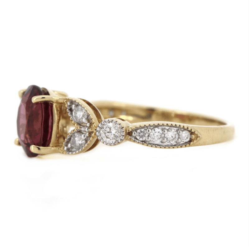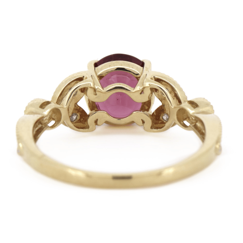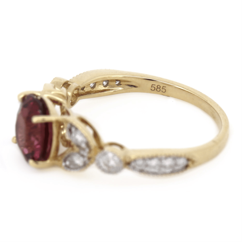 14K YELLOW GOLD, RHODOLITE GARNET AND DIAMOND, DRESS RING.