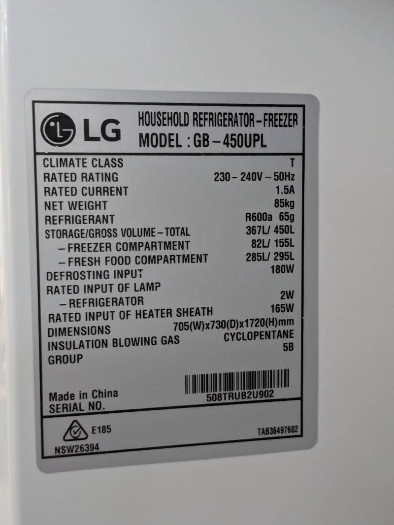 Refrigerator, LG 450L fridge/ freezer model no. GB-450UPL