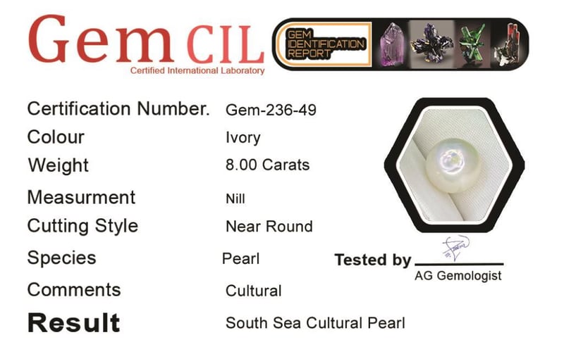 8.00 CARATS SOUTH SEA PEARL 8.00 Carats South Sea Pearl Stone = South Sea Pearl Weight = 8.00 Carats Treatment = CulturalQuantity = 1Note = Gem Cil, Certified, Condition: Good - Refer Images 0488462+49