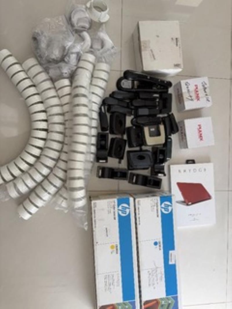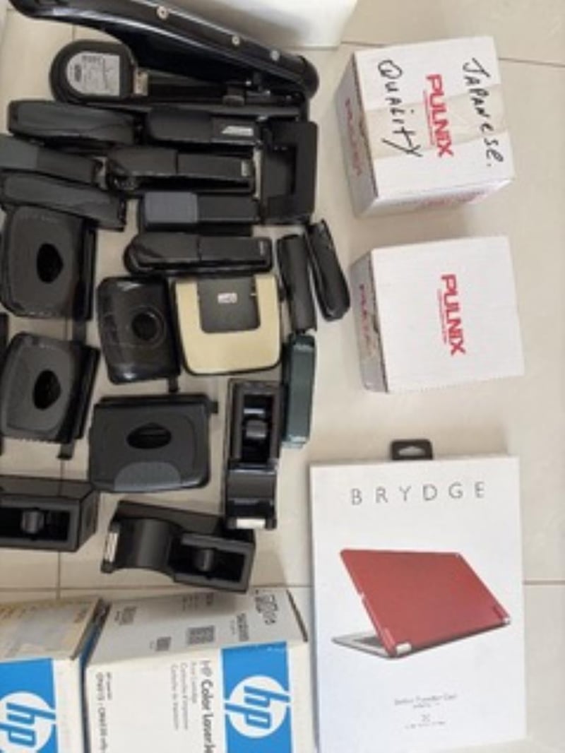 Lot of bulk hole punches, staplers and tape dispensers5 x cable management Umbilical Cable Management2x HP laserjet printer cartridges 2 x Pulnix CCTV camera1x BRYDGE iPad Pro Caselot of AXIS dome camera casesSold as used and untested