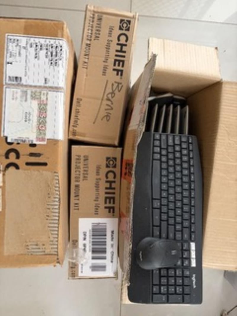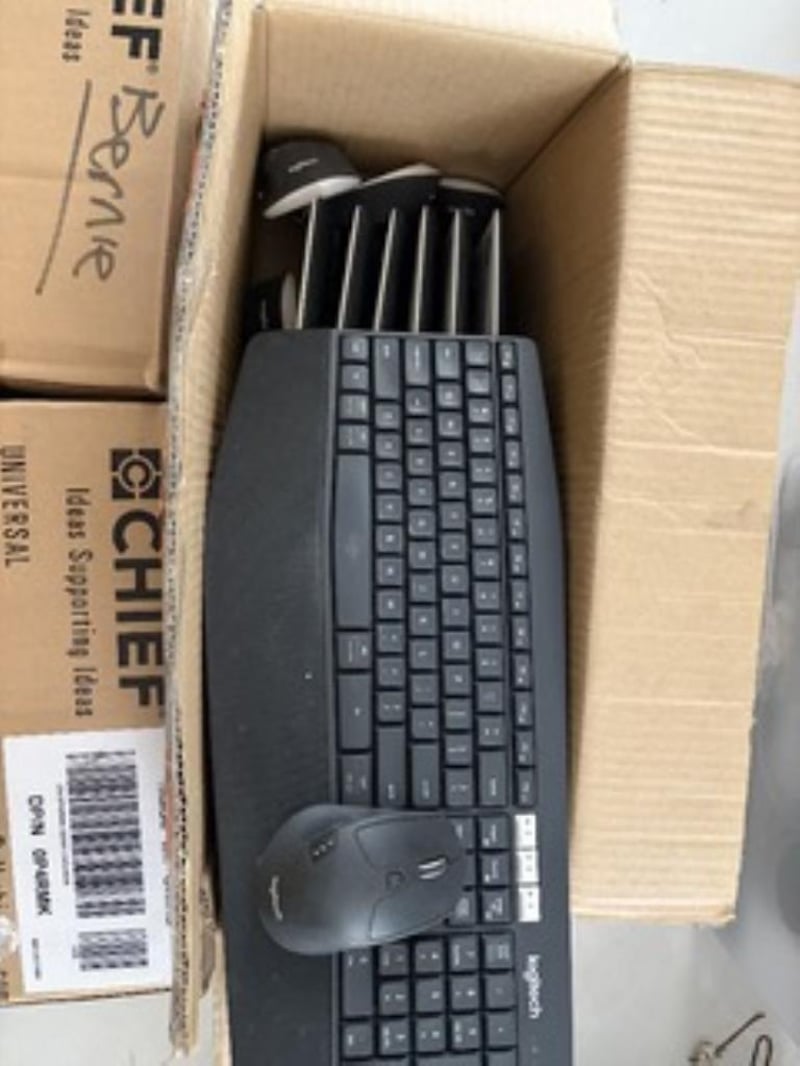 Box of Logitech wireless keyboards and mousesUniversal Mount KitCisco Data cardSold as used and untested