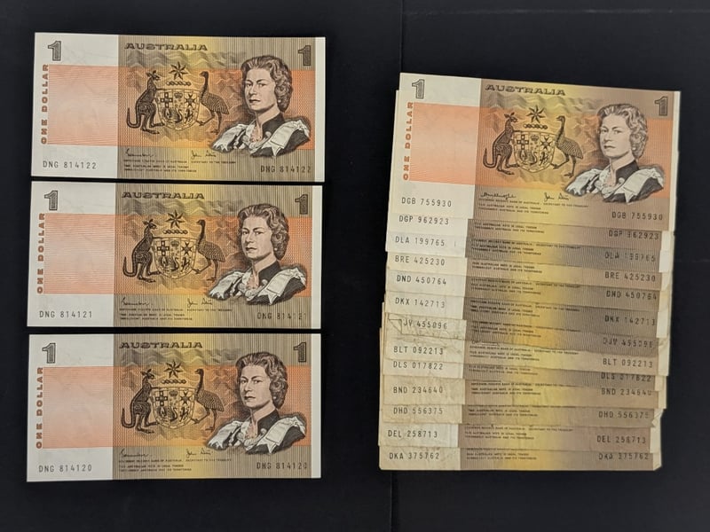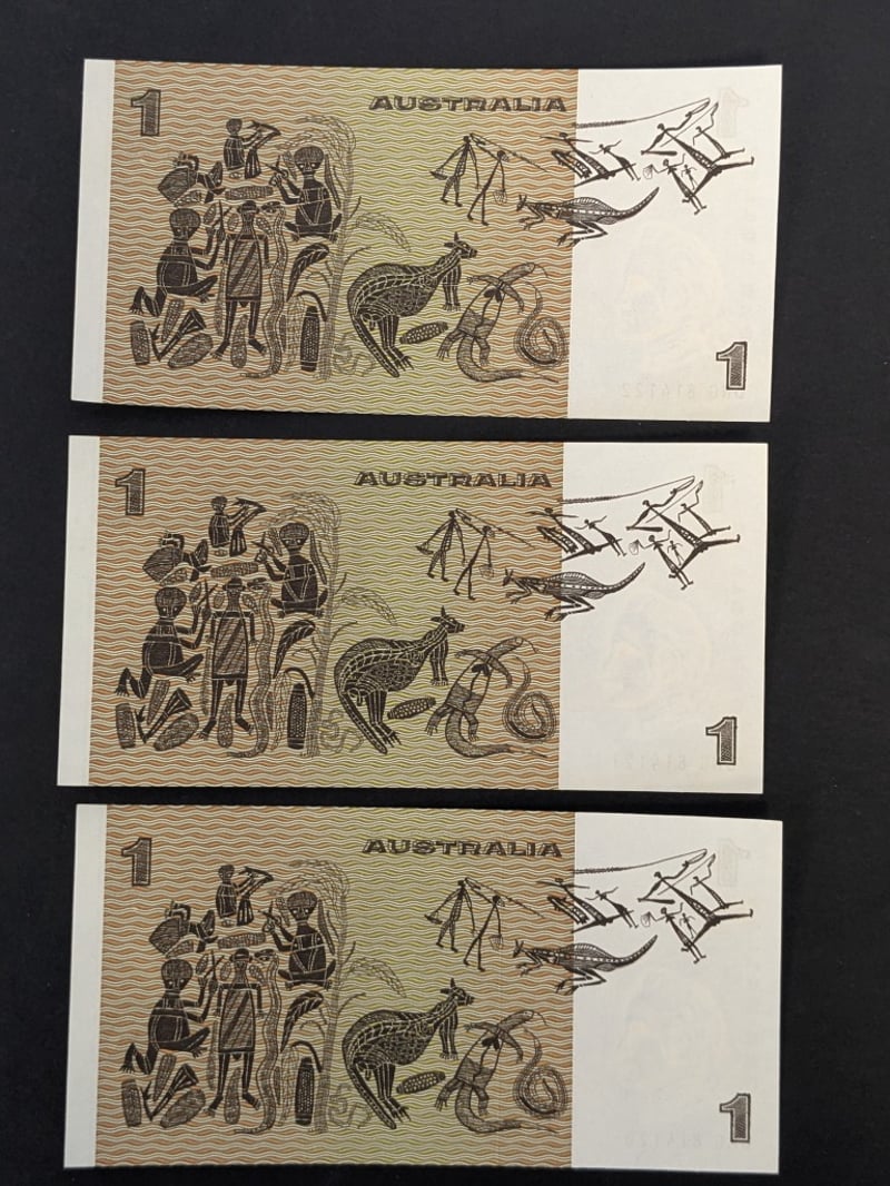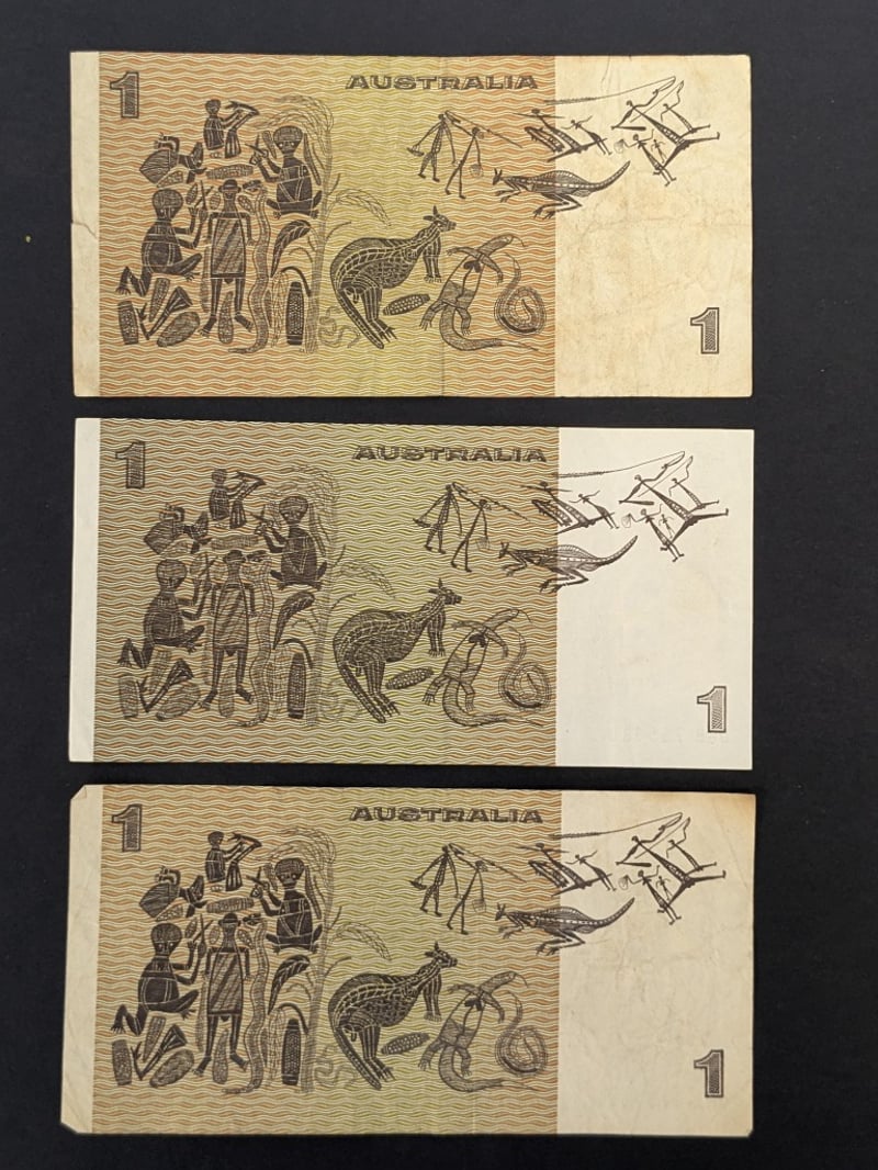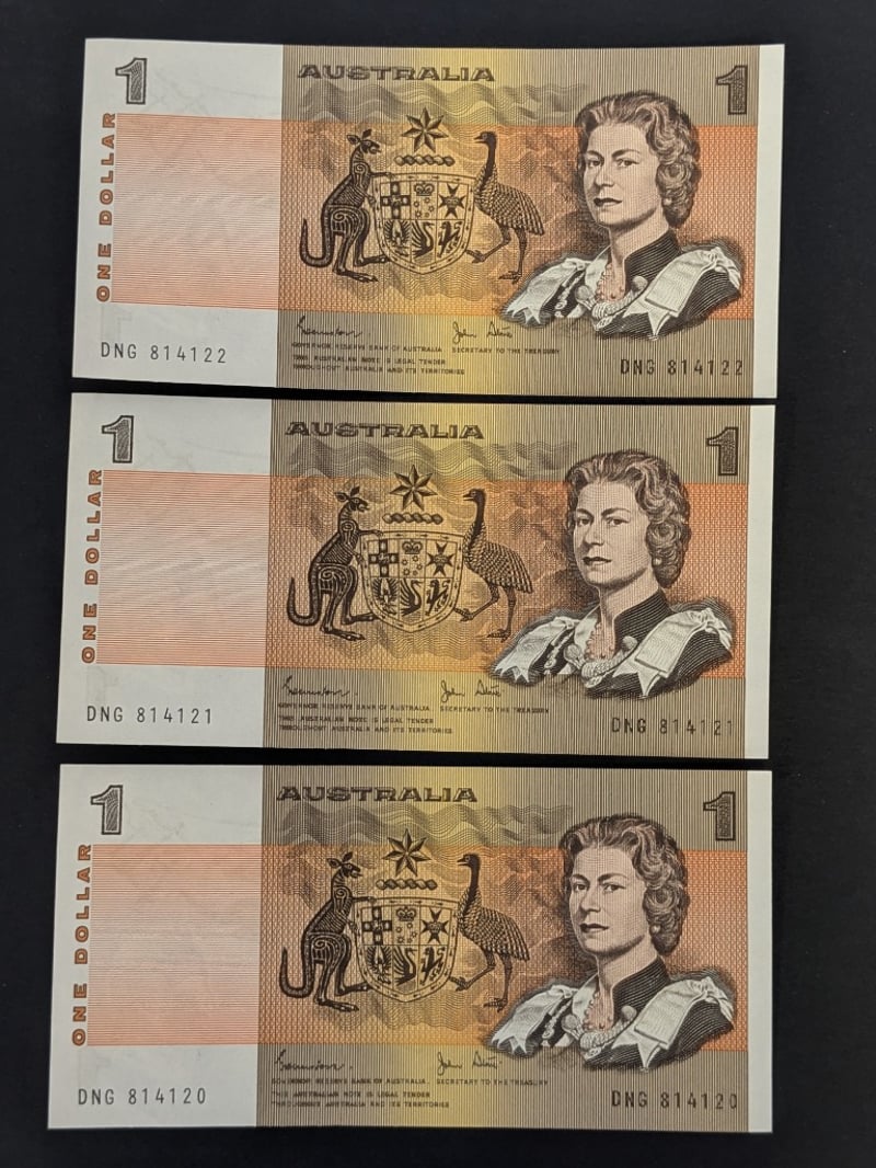 3 X 1982 AUSTRALIAN ONE DOLLAR JOHNSTONE / FRASER CONSECUTIVE BANK NOTES
