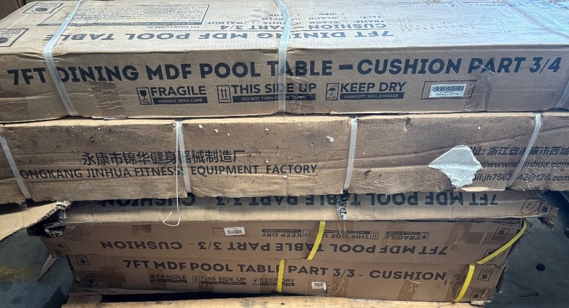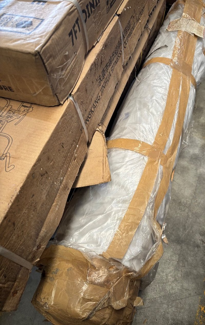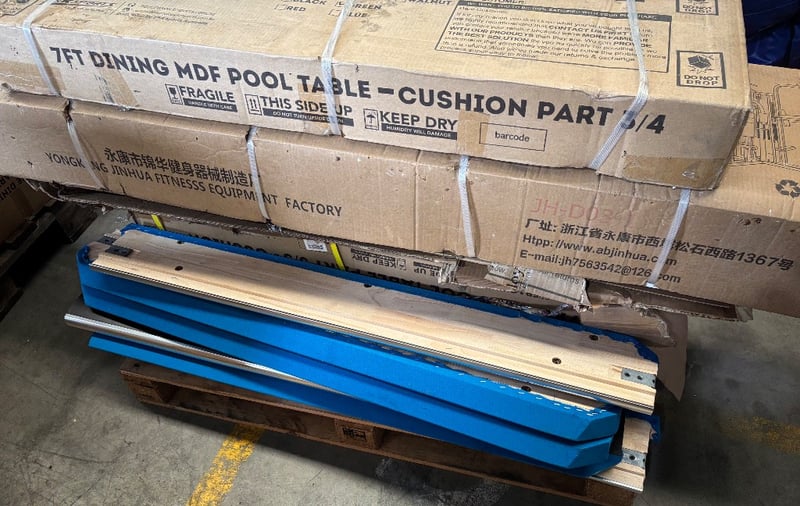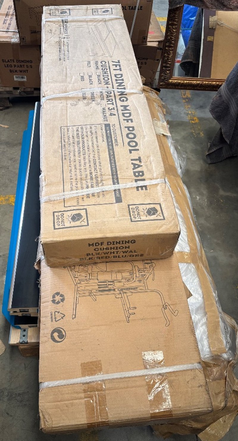 Flat packed furniture, including 7fy dining MDF pool table, gym equipment, roll of fabric Note; Sold as lot