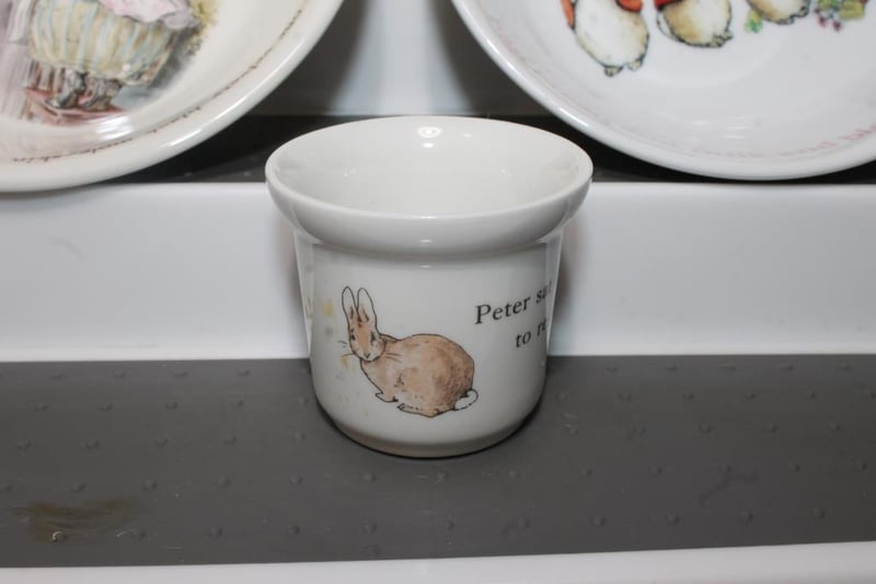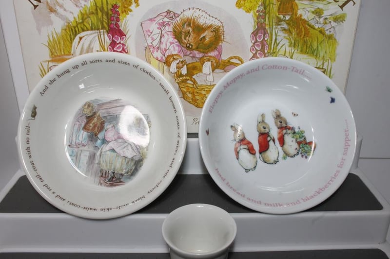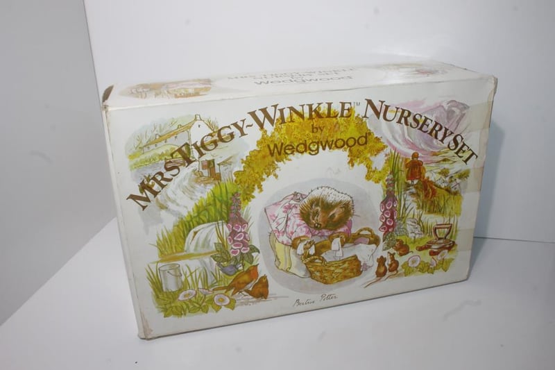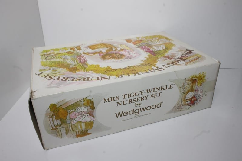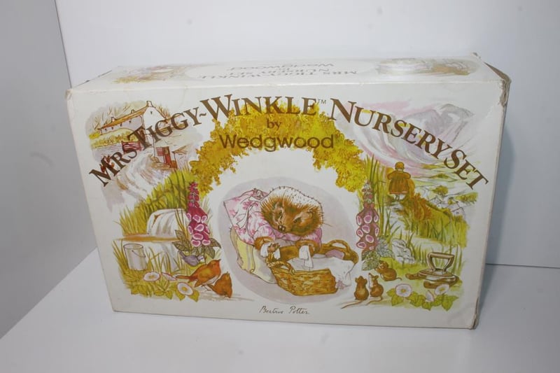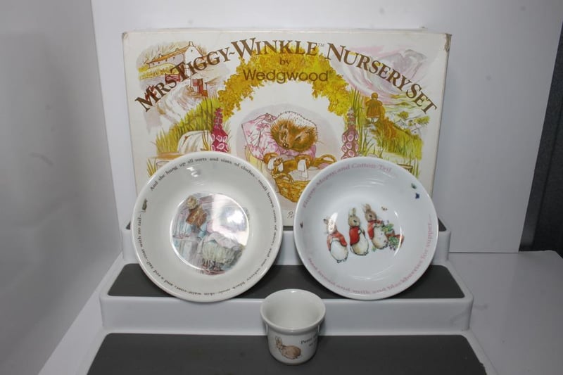Mrs Tiggy-Winkle Nursery Set by Wedgwood – Bowls and Cup with BoxWedgwood Mrs Tiggy-Winkle nursery set including two bowls and one cup.Illustrated Peter Rabbit characters; original Wedgwood box included, contents as shown.