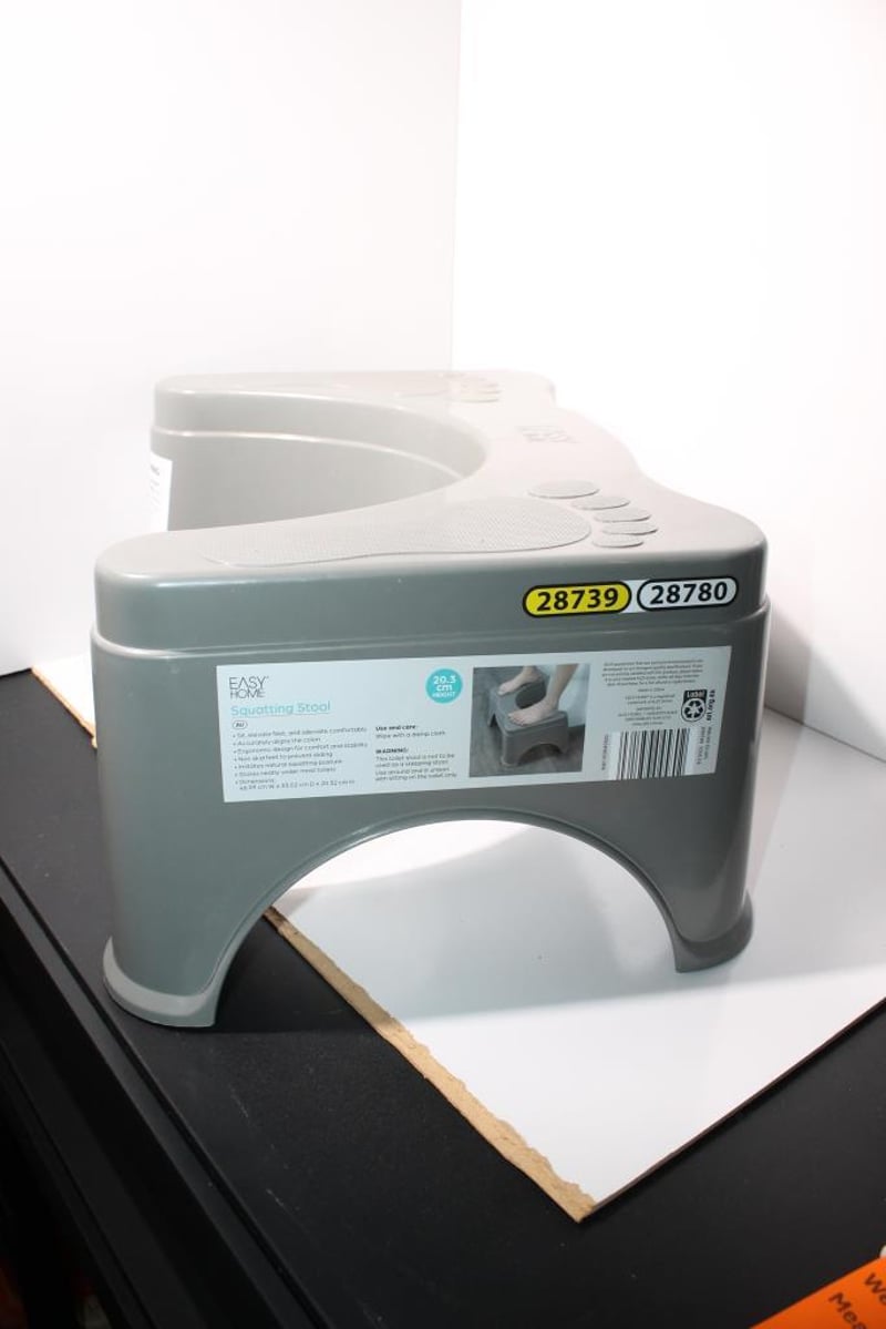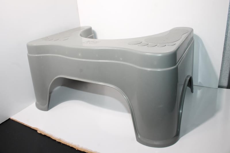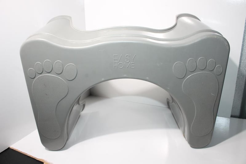 Grey plastic Easy Home squatting stool with textured foot pads.