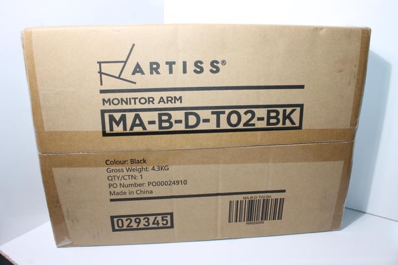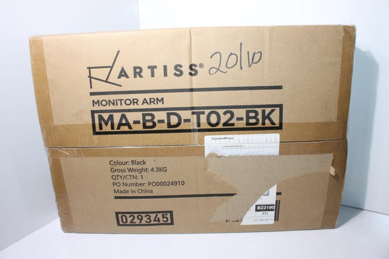 Artiss Monitor Arm MA-B-D-T02-BK BlackBoxed Artiss monitor arm, model MA-B-D-T02-BK, colour black.Box states gross weight 4.3 kg, quantity 1, made in China; box shows wear and tape.