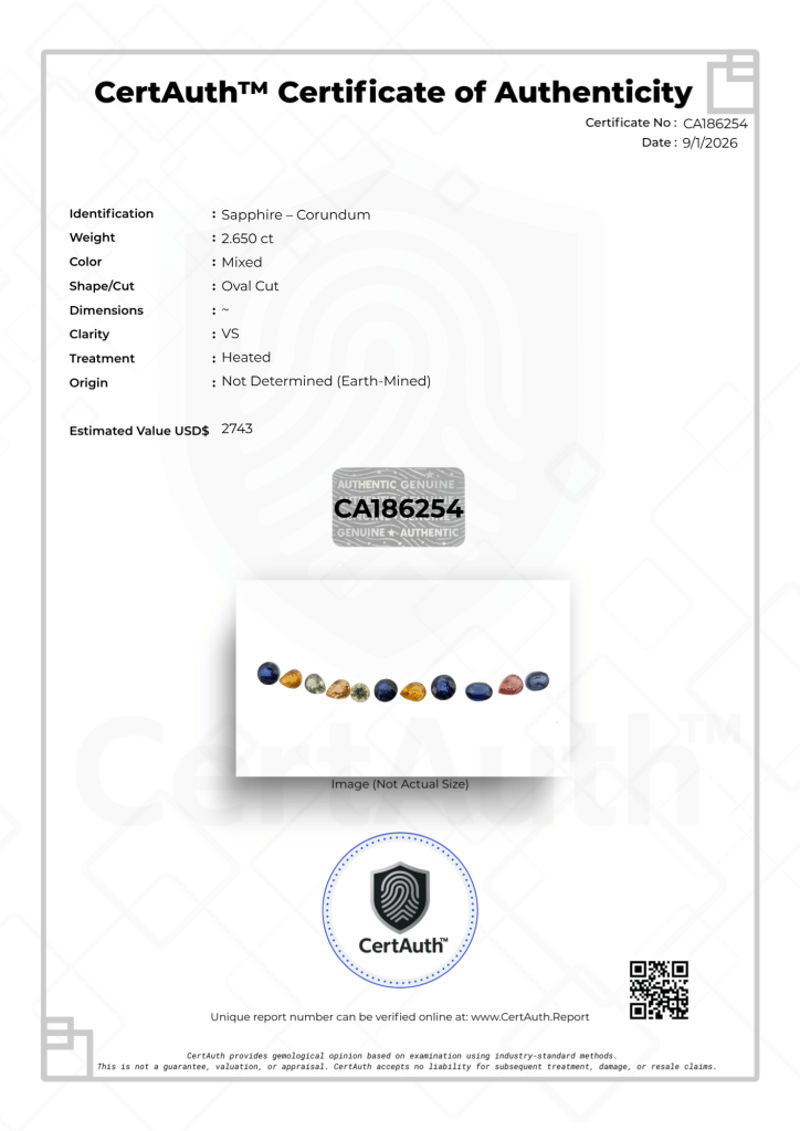 NATURAL 2.650CT MIXED COLOUR SAPPHIRE CORUNDUM OVAL CUT HEATED WITH CERTAUTH DIGITAL CERTIFICATE This Natural Sapphire (Corundum) Displays A Mixed Colour Appearance And Is Fashioned Into An Oval Cut. With A Weight Of 2.650 Ct And Vs Clarity, This Earth-Mined Gemstone Has Undergone Heat Treatment. This Listing Includes A Certauth Digital Certificate Of Authenticity For Secure Online Verification.• Gemstone: Sapphire – Corundum• Carat Weight: 2.650 Ct• Colour: Mixed• Cut: Oval Cut• Clarity: Vs• Treatment: Heated• Dimensions: ~• Origin: Not Determined (Earth-Mined)• Certification: Certauth Digital Certificate (Ca186254)• Estimated Value: $2,743 Usd Condition: Good - Refer Images 0488473+34