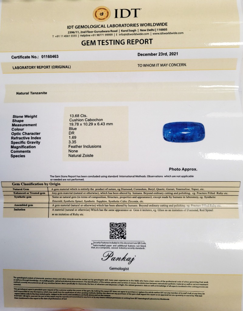 13.68CT CERTIFIED TANZANITE BLUE CUSHION SHAPE , IDT CERTIFIEDDimensions: Height: 19.78mm, Width: 10.29mm, Depth: 6.43mmCondition: Good - Refer To Images488436+28