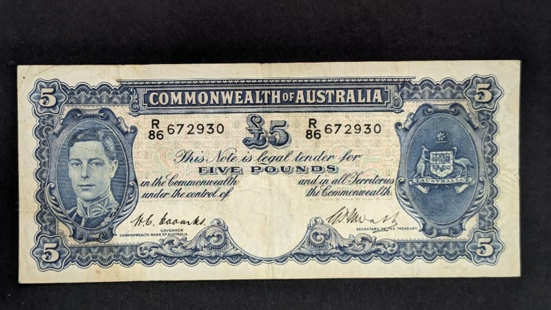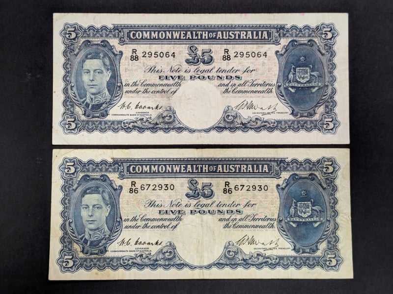 2 X 1949 AUSTRALIAN COOMBS / WATT FIVE POUND BANK NOTES R86 672930 R88 295064232866+14