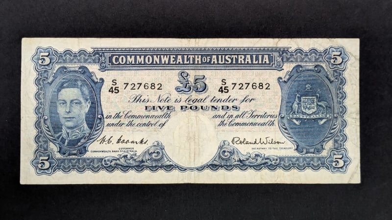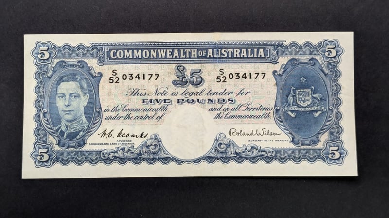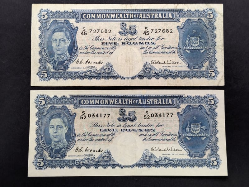 2 X 1952 AUSTRALIAN COOMBS / WILSON FIVE POUND BANK NOTES S45 727682S52 034177232866+16