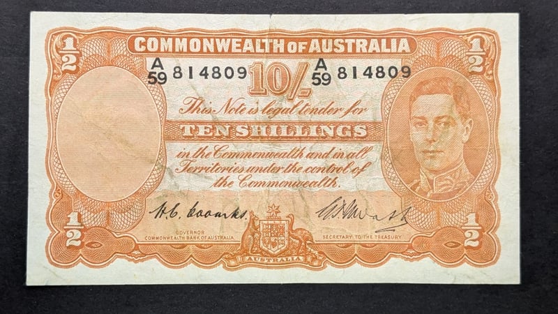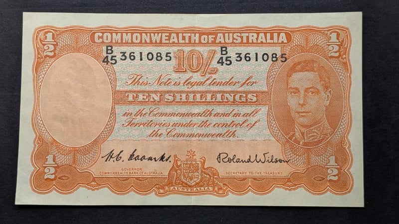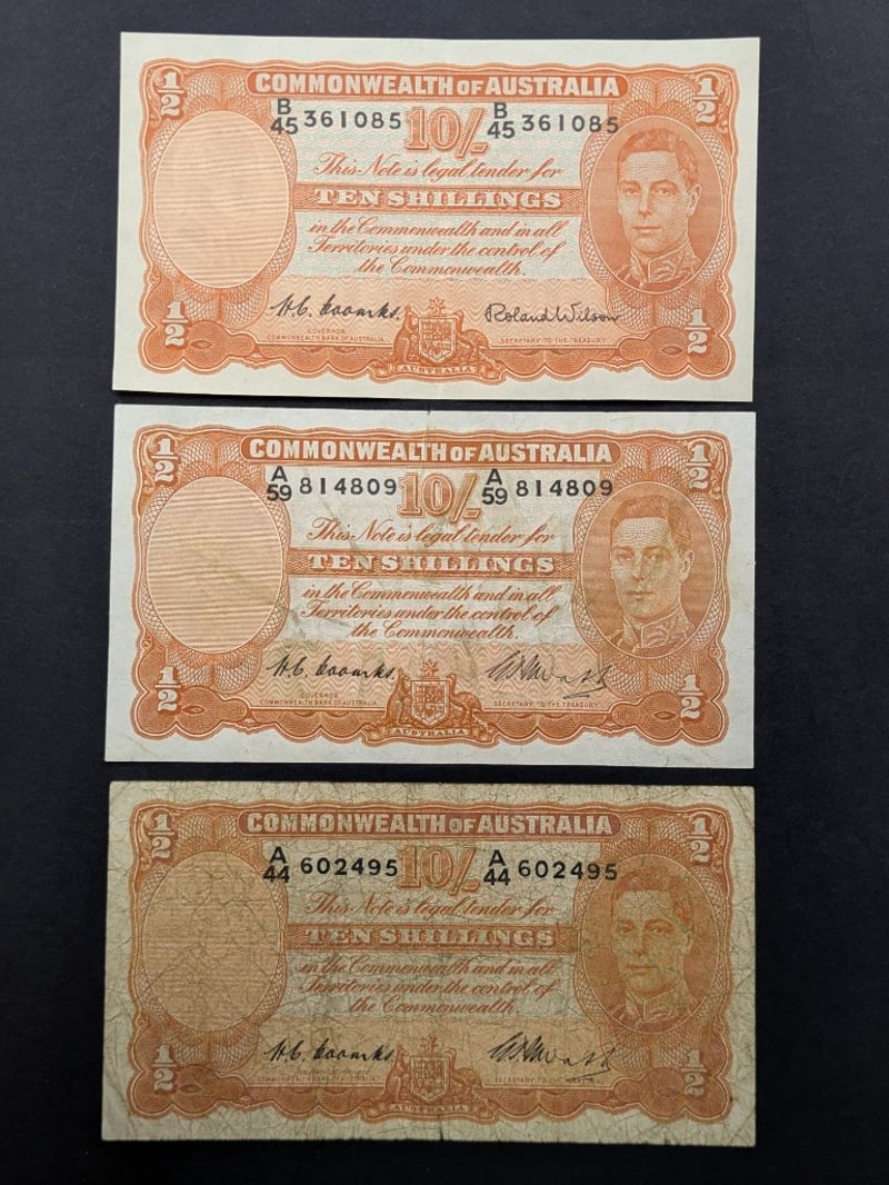 3 X AUSTRALIAN TEN SHILLINGS BANK NOTES INCLUDES 1945 COOMBS / WATTS BANK NOTE A44 6024951945 COOMBS / WATT BANK NOTE A59 814809 1952 COOMBS / WILSON BANK NOTE B45 362085232866+17