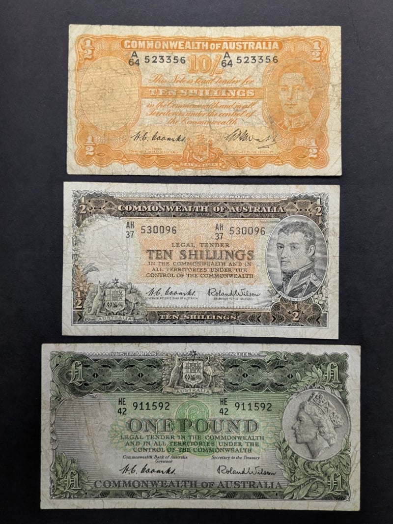 3 X AUSTRALIAN BANK NOTES INCLUDES 1949 COOMBS / WATTS TEN SHILLINGS BANK NOTE A64 5233561961 COOMBS / WILSON TEN SHILLINGS RESERVE BANK NOTE AH37 5300961953 COOMBS / WILSON ONE POUND COMMONWEALTH BANK NOTE HE42 911592232866+20