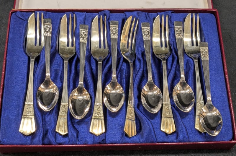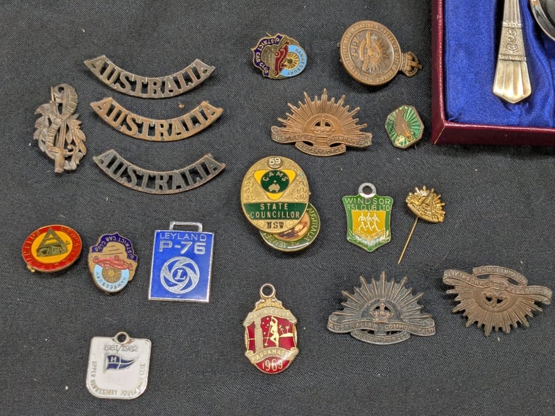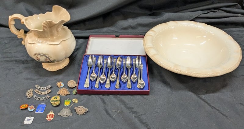 TWO CERAMIC HOMEWARES, EPNS CUTLERY SET, AND COLLECTION OF BADGES585058+27