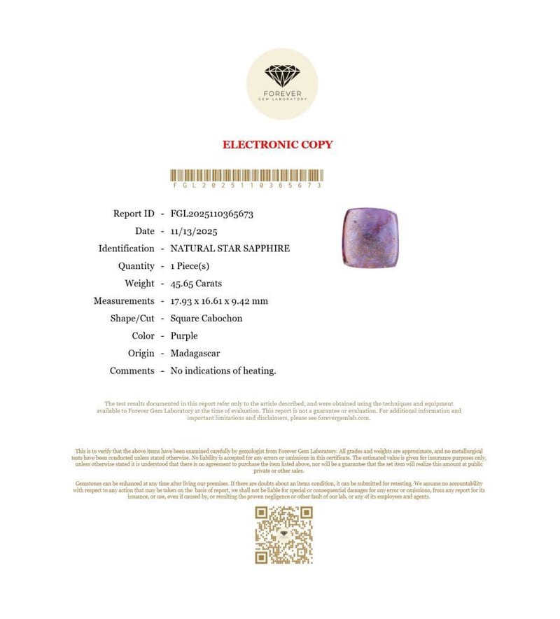 45.65 CARATS NATURAL STAR SAPPHIRE 45.65 Carats Natural Star SapphireCertificate Number - Fgl2025110365673Color - PurpleShape - Square CabochonDimension - 17.93 X 16.61 X 9.42 MmOrigin - MadagascarComments - No Indications Of Heating.Good Quality With Luster Condition: Good - Refer Images 0488471+6