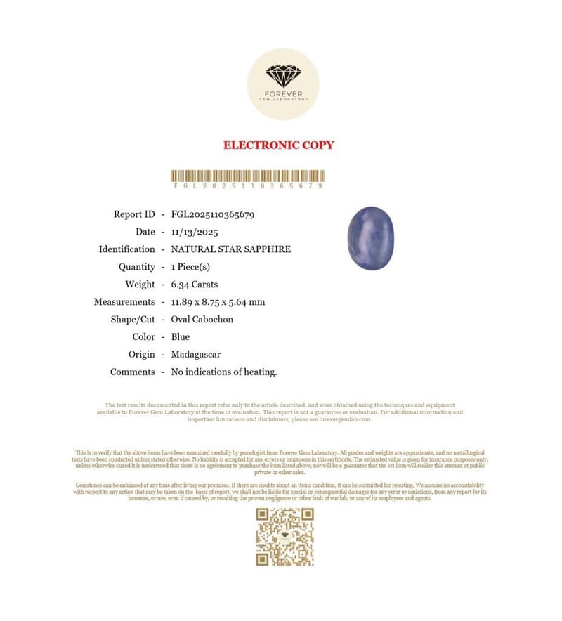 6.34 CARATS NATURAL BLUE STAR SAPPHIRE 6.34 Carats Natural Star SapphireCertificate Number - Fgl2025110365679Color - BlueShape - Oval CabochonDimension - 11.89 X 8.75 X 5.64 MmOrigin - MadagascarComments - No Indications Of Heating.Good Quality With Luster Condition: Good - Refer Images 0488471+12