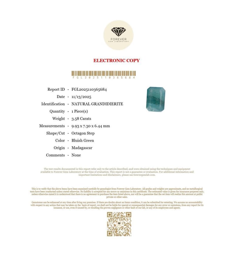3.58 CARATS NATURAL GRANDIDIERITE 3.58 Carats Natural GrandidieriteCertificate Number - Fgl2025110365684Color - Bluish GreenShape - Octagon StepDimension - 9.93 X 7.30 X 6.44 MmOrigin - MadagascarComments - NoneGood Quality With Luster Condition: Good - Refer Images 0488471+17