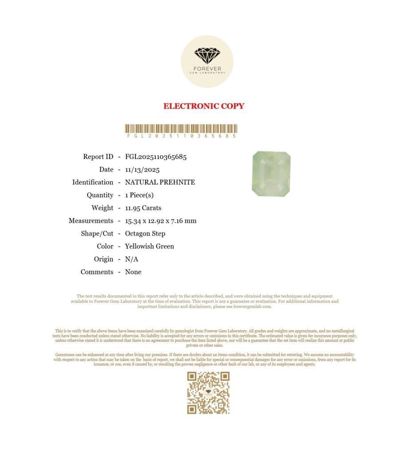 11.95 CARATS NATURAL PREHNITE 11.95 Carats Natural PrehniteCertificate Number - Fgl2025110365685Color - Yellowish GreenShape - Octagon StepDimension - 15.34 X 12.92 X 7.16 MmOrigin - N/AComments - NoneGood Quality With Luster Condition: Good - Refer Images 0488471+18