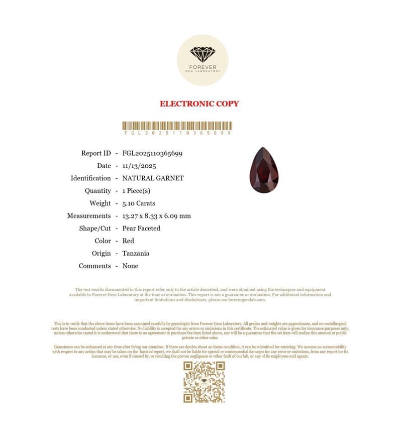 5.10 CARATS NATURAL GARNET 5.10 Carats Natural GarnetCertificate Number - Fgl2025110365699Color - RedShape - Pear FacetedDimension - 13.27 X 8.33 X 6.09 MmOrigin - TanzaniaComments - NoneGood Quality With Luster Condition: Good - Refer Images 0488471+32