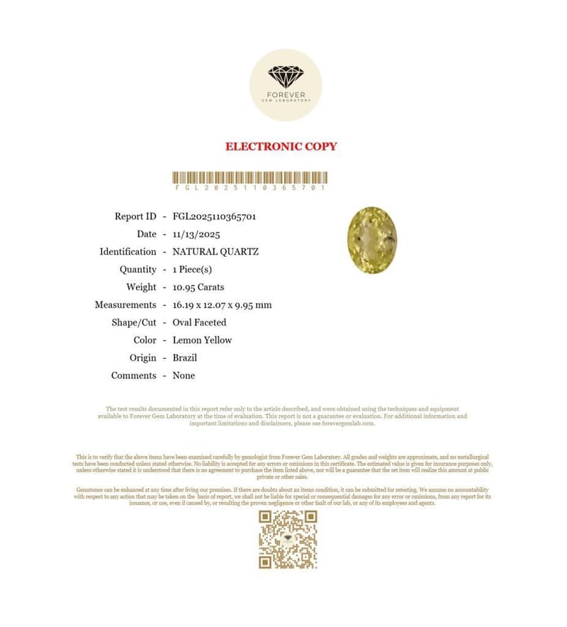 10.95 CARATS NATURAL LEMON QUARTZ 10.95 Carats Natural QuartzCertificate Number - Fgl2025110365701Color - Lemon YellowShape - Oval FacetedDimension - 16.19 X 12.07 X 9.95 MmOrigin - BrazilComments - NoneGood Quality With Luster Condition: Good - Refer Images 0488471+34