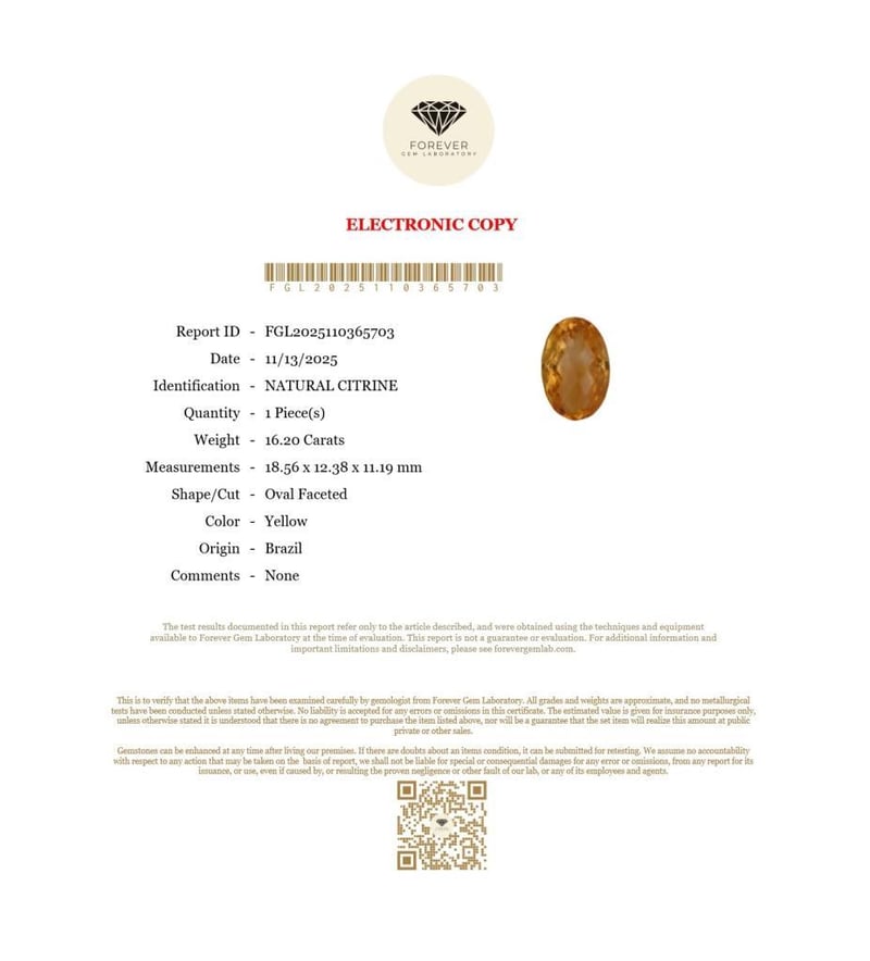 16.20 CARATS NATURAL CITRINE 16.20 Carats Natural CitrineCertificate Number - Fgl2025110365703Color - YellowShape - Oval FacetedDimension - 18.56 X 12.38 X 11.19 MmOrigin - BrazilComments - NoneGood Quality With Luster Condition: Good - Refer Images 0488471+36