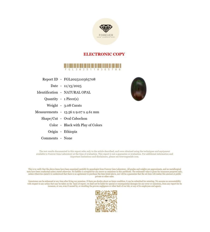 3.08 CARATS NATURAL BLACK OPAL 3.08 Carats Natural OpalCertificate Number - Fgl2025110365708Color - Black With Play Of ColorsShape - Oval CabochonDimension - 13.56 X 9.07 X 4.61 MmOrigin - EthiopiaComments - NoneGood Quality With Luster Condition: Good - Refer Images 0488471+41