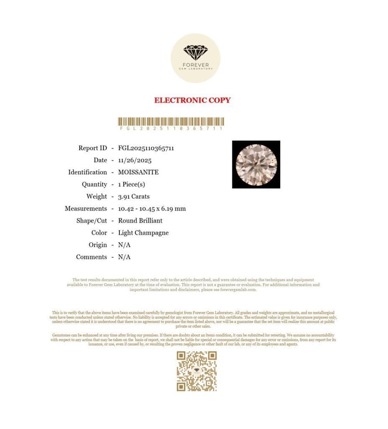 3.91 CARATS MOISSANITE 3.91 Carats MoissaniteCertificate Number - Fgl2025110365711Color - Light ChampagneShape - Round BrilliantDimension - 10.42 - 10.45 X 6.19 MmOrigin - N/AComments - N/AGood Quality With Luster Condition: Good - Refer Images 0488471+44