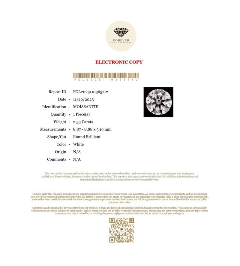 2.33 CARATS MOISSANITE 2.33 Carats MoissaniteCertificate Number - Fgl2025110365712Color - WhiteShape - Round BrilliantDimension - 8.87 - 8.88 X 5.19 MmOrigin - N/AComments - N/AGood Quality With Luster Condition: Good - Refer Images 0488471+45