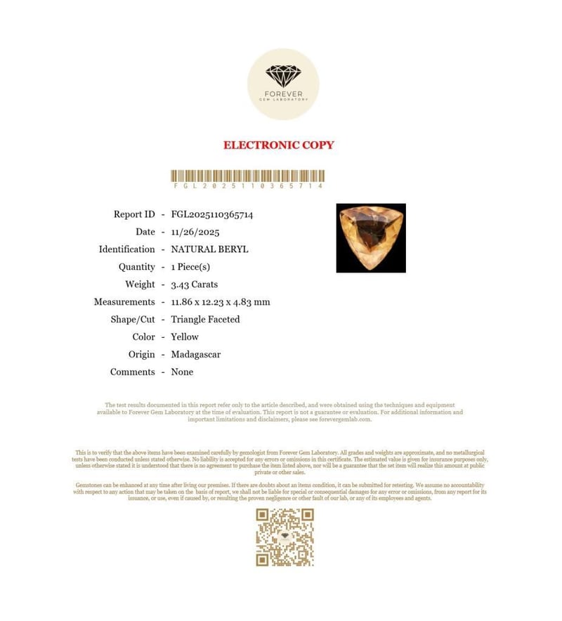 3.43 CARATS NATURAL YELLOW BERYL 3.43 Carats Natural BerylCertificate Number - Fgl2025110365714Color - YellowShape - Triangle FacetedDimension - 11.86 X 12.23 X 4.83 MmOrigin - MadagascarComments - NoneGood Quality With Luster Condition: Good - Refer Images 0488471+47