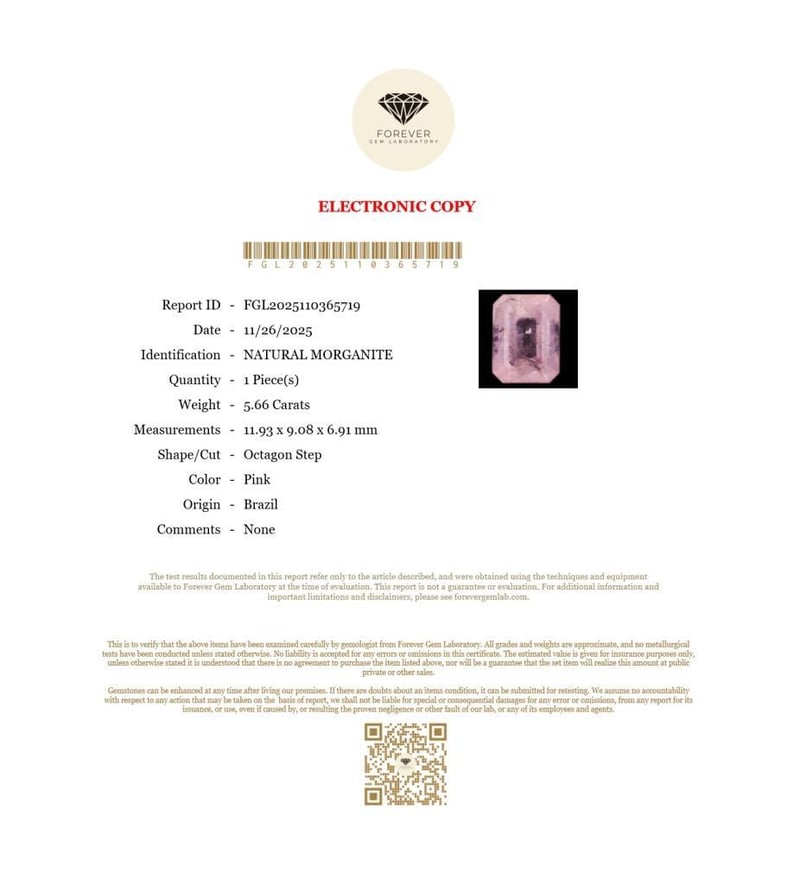 5.66 CARATS NATURAL PINK MORGANITE 5.66 Carats Natural MorganiteCertificate Number - Fgl2025110365719Color - PinkShape - Octagon StepDimension - 11.93 X 9.08 X 6.91 MmOrigin - BrazilComments - NoneGood Quality With Luster Condition: Good - Refer Images 0488471+52