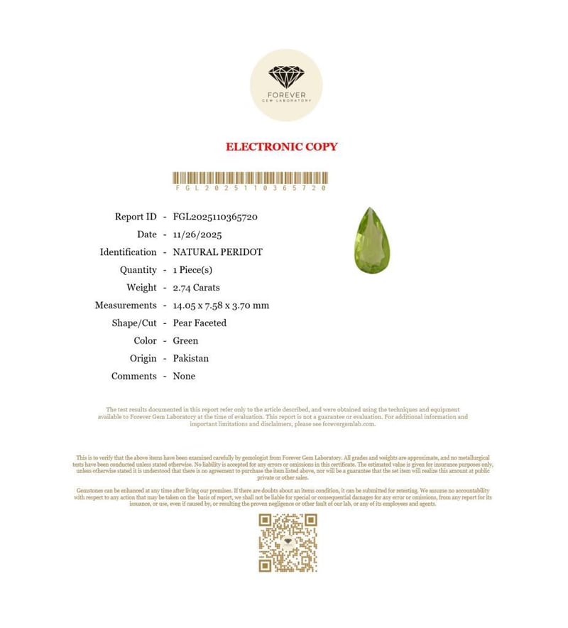 2.74 CARATS NATURAL PERIDOT 2.74 Carats Natural PeridotCertificate Number - Fgl2025110365720Color - GreenShape - Pear FacetedDimension - 14.05 X 7.58 X 3.70 MmOrigin - PakistanComments - NoneGood Quality With Luster Condition: Good - Refer Images 0488471+53
